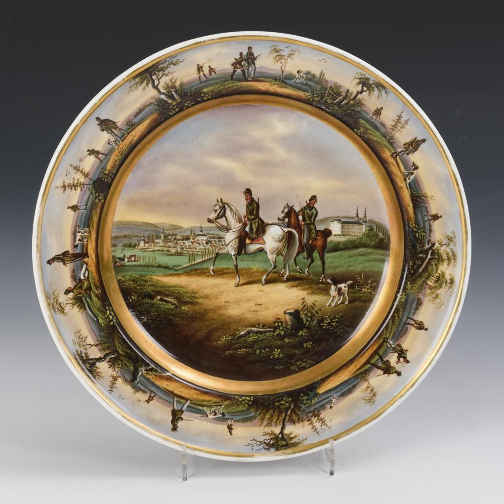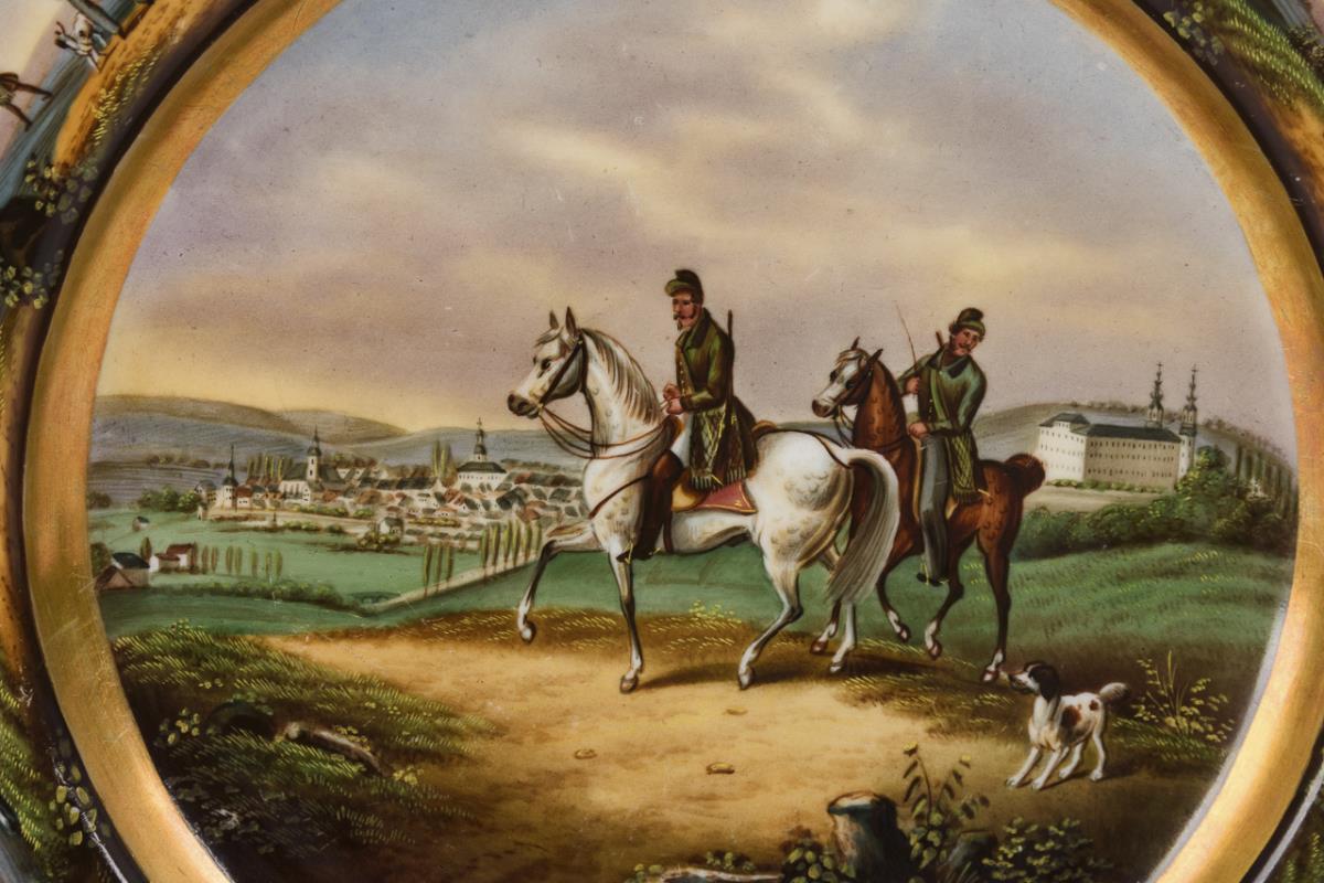 Im Spiegel die Darstellung zweier berittener Jäger in einer weiten Landschaft, im Hintergrund eine Ortsansicht mit Schloss, auf der Fahne Jagdmotive. Gold etwas berieben.