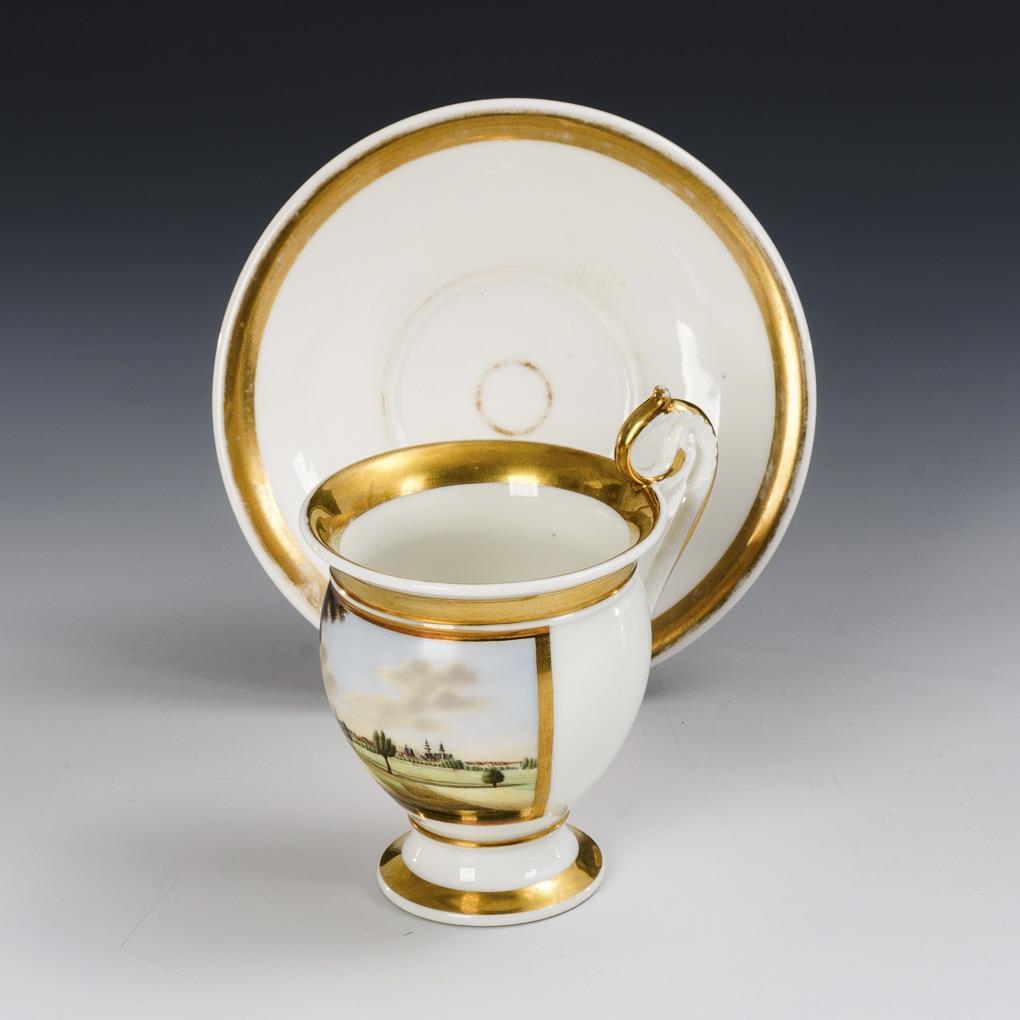 Polychrom bemalt, goldstaffiert. Tasse (H 11 cm), ergänzte Untertasse (Ø 14 cm).