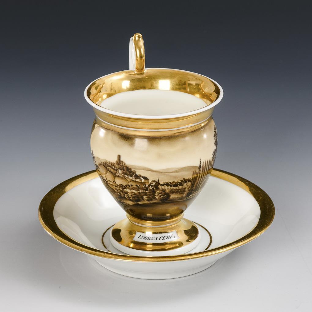 Gefußte Glockentasse mit Greifenkopfhenkel. Schauseitig eine goldgerahmte Rechteckkartusche mit der sepiagemalten Ansicht von Bad Lobenstein mit Blick auf die Burgruine.