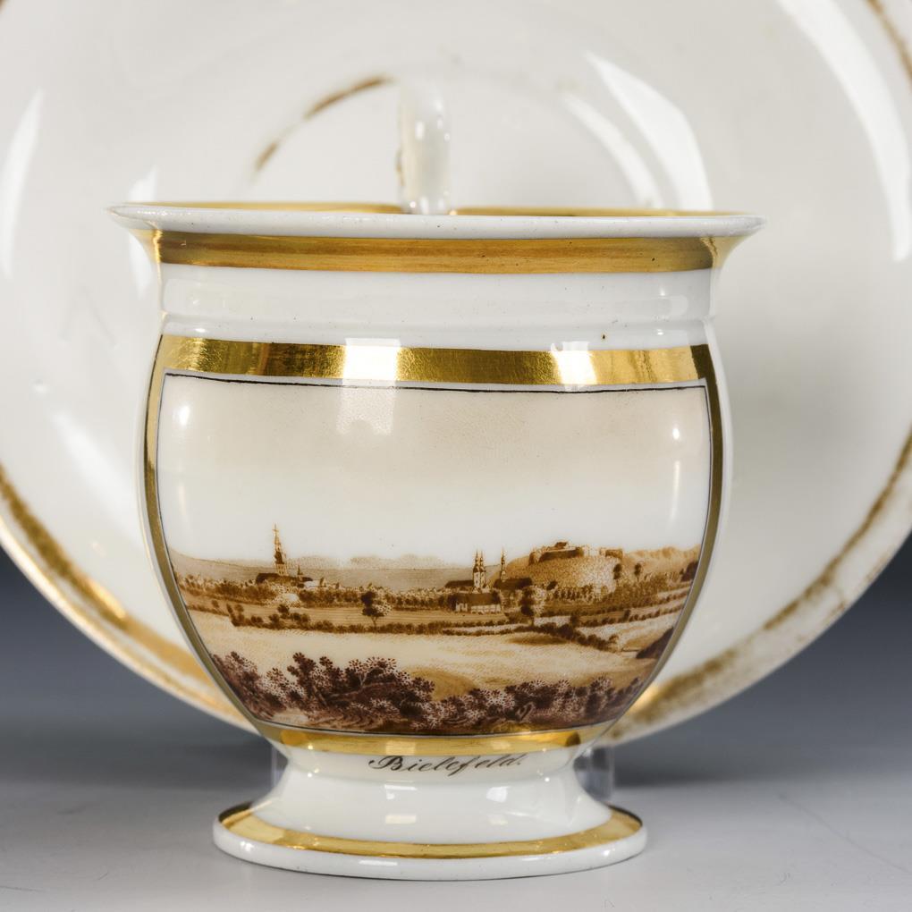 Gefußte Glockentasse mit Rosettenhenkel. Schauseitig eine goldgerahmte Rechteckkartusche mit der bezeichneten, sepiagemalten Ansicht der Stadt Bielefeld. Gold der Untertasse berieben.