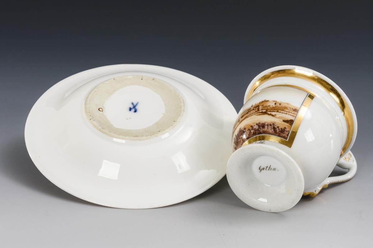 Sepiamalerei, Goldstaffage. Tasse (H 8,5 cm), ergänzte Untertasse (Ø 13,5 cm).