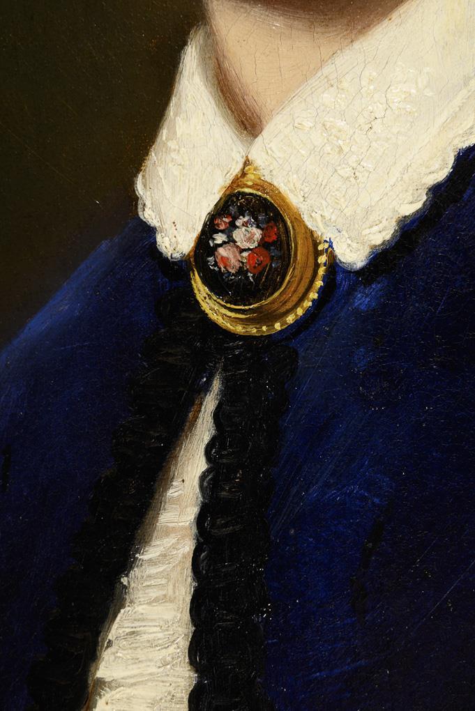 Porträt einer jungen Frau in samtblauer Jacke mit weißer Bluse und großer Brosche vor neutralem Hintergrund. Leicht verschmutzter Firnis.