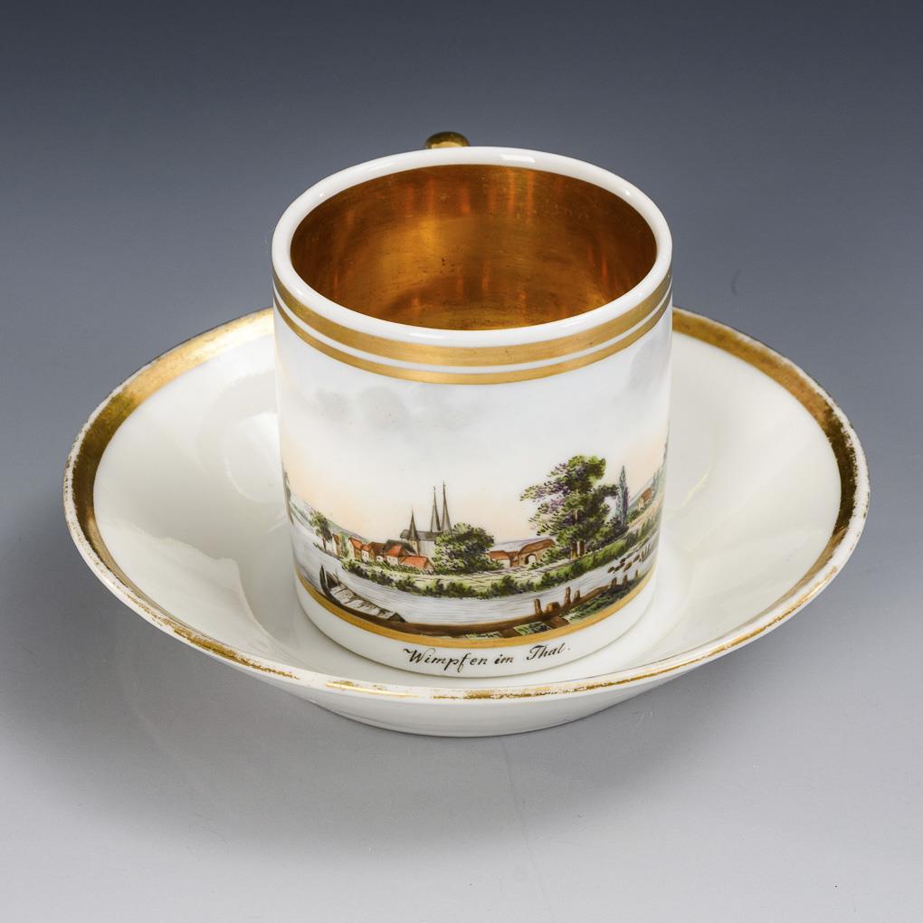 Zylindertasse mit Ohrenhenkel. Schauseitig eine goldgerahmte Rechteckkartusche mit der bezeichneten Ansicht der Stadt Wimpfen am Neckar. Minimaler Goldabrieb an der Untertasse.