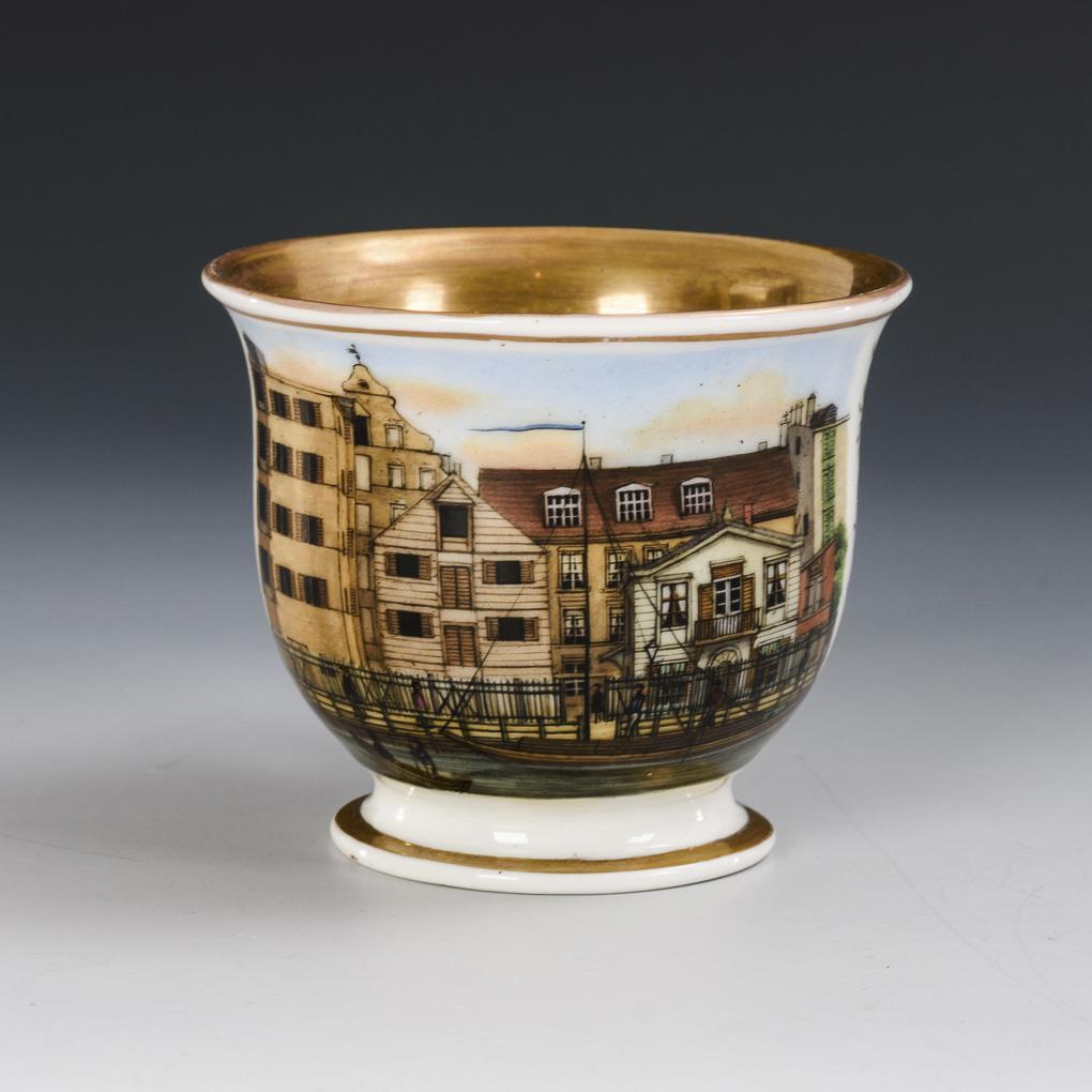 Polychrom bemalt, goldstaffiert. 4 Tassen (H 6,5-13,5 cm), 4 ergänzte Untertassen (Ø 12,5-15 cm).