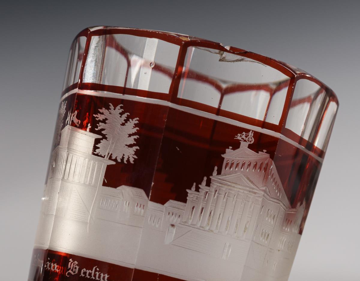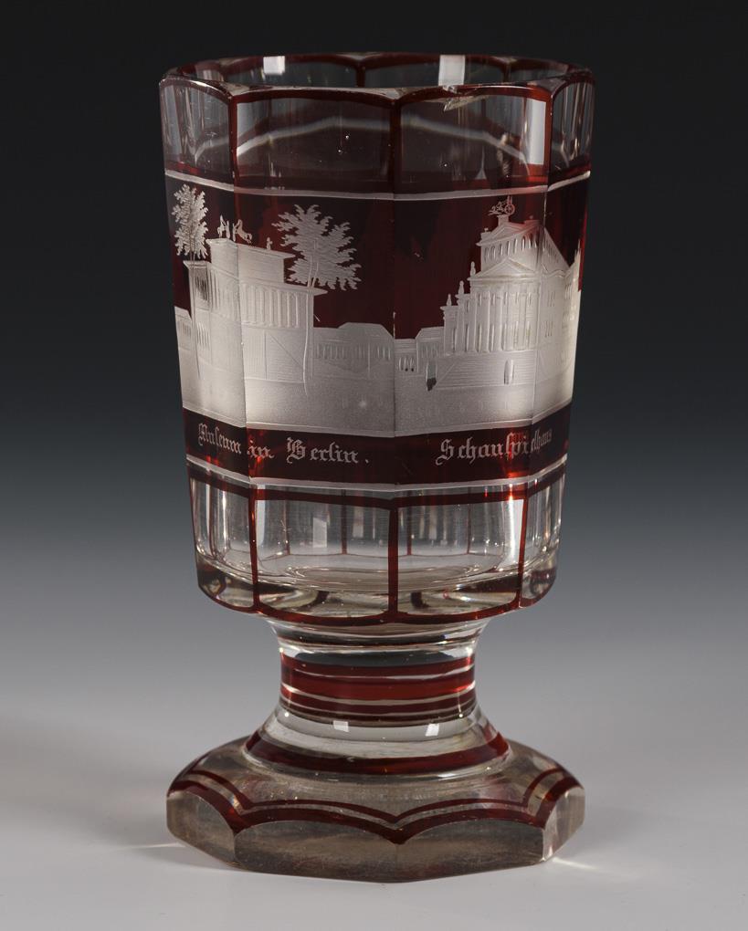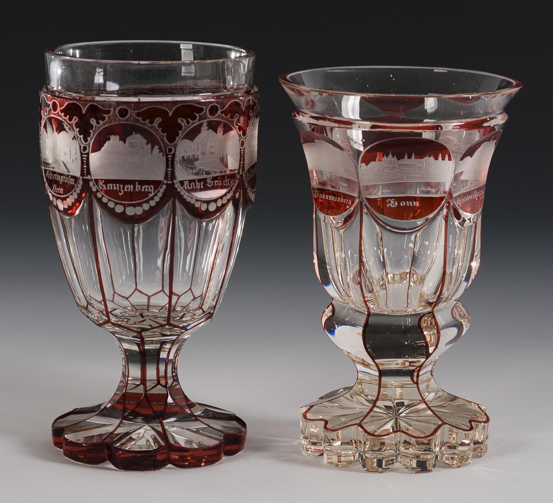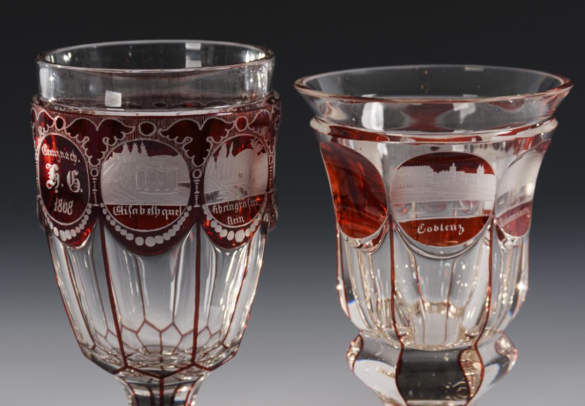 Kelchgläser mit gravierten Ansichten (u.a. Rheinansichten, Bad Kreuznach, Berlin). 1x mit Randbestoßung.