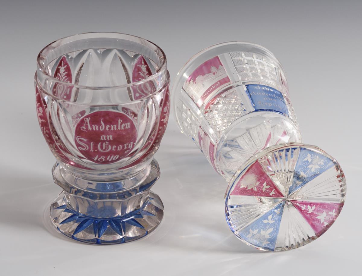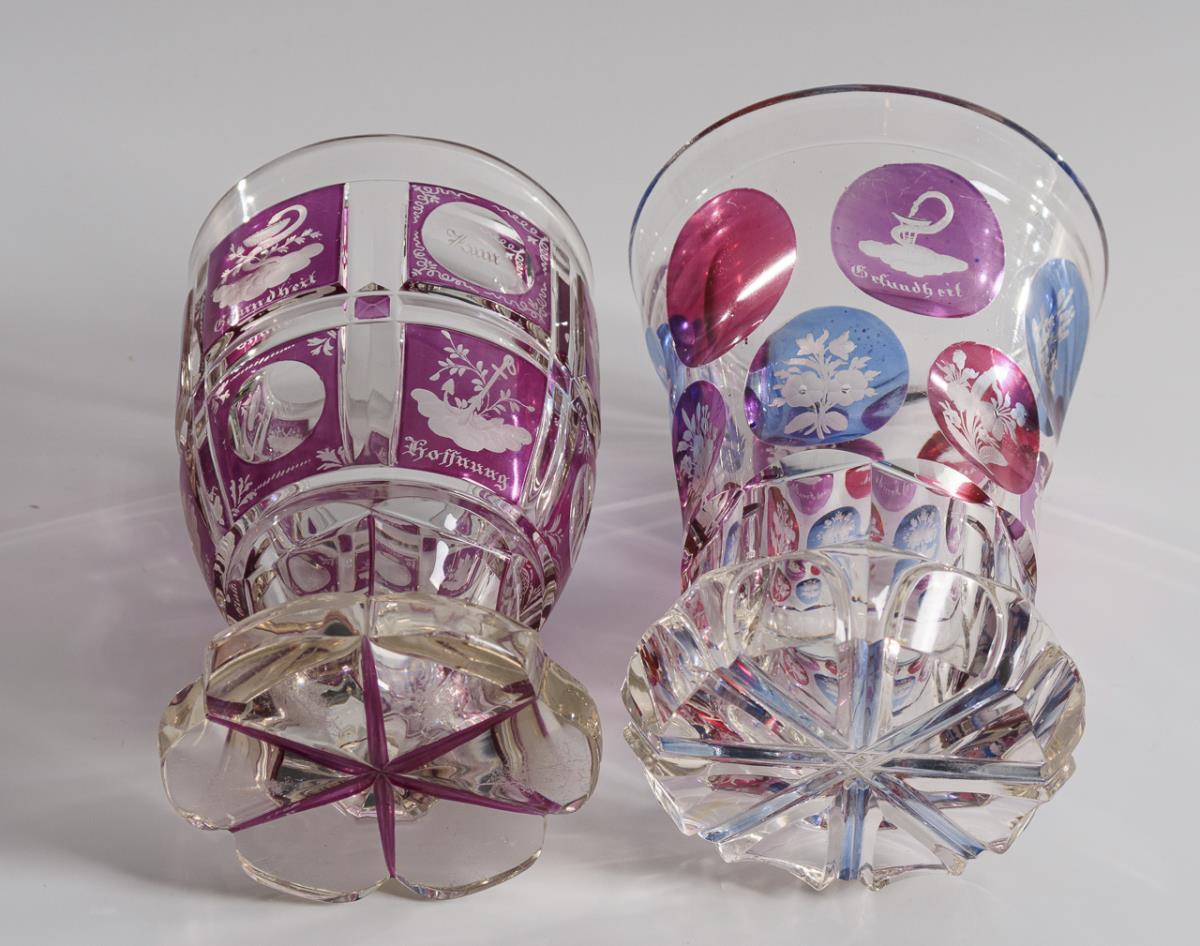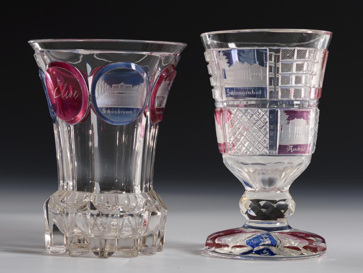 2x mit gravierten Ansichten (Teplitz, Baden, Luxemburg, Mariabrunn, Schönbrunn, Klosterneuburg). / 3x mit gravierten und bezeichneten Symbolarrangements bzw. Blumenbuketts. 3x Bestoßungen am Stand.
