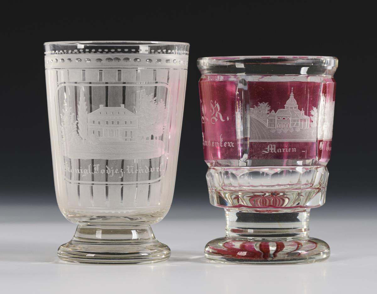 5 Kelchgläser mit gravierten Ansichten (u.a. Karlsbad, Wiesbaden, Landeck, Neudorf, Harzburg). 1 Fuß bestoßen.