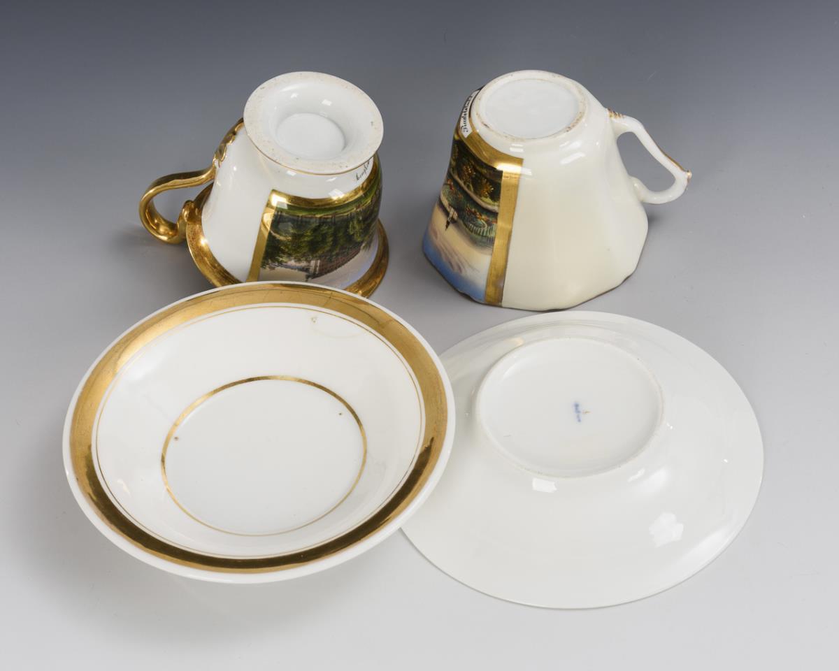 1x gefußte Glockentasse mit Pantherkopfhenkel und schauseitigen, bezeichneten Ansicht der Schwarzburg. / 1x polygonale Glockentasse mit Rocaillehenkel und der schauseitigen, bezeichneten Ansicht von Rudolstadt. Minimaler Goldabrieb, 1 Untertasse mit geklebtem Randausbruch, 1 Tasse (Rudolstadt) restauriert, 1 Tasse (Schwarzburg) mit Wandungshaarriss.