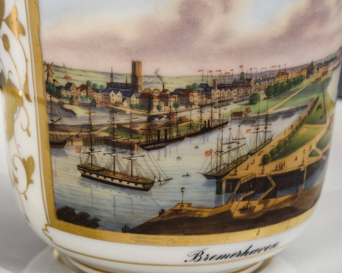Große Glockentasse mit Rocaillehenkel. Schauseitig eine goldgerahmte Rechteckkartusche mit der bezeichneten Ansicht von Bremerhaven. Bestoßung am Standring der Untertasse, kleiner Chip am Henkel.