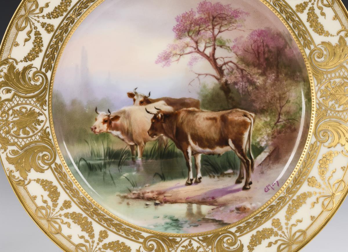 1x signiert "P.V.": kobaltblaue Fahne mit ornamentaler Reliefgoldmalerei, im Spiegel die Darstellung eines seine zwei Pferde am Fluss tränkenden Bauern. / 1x signiert "C. May": weißer Fahnenfond mit prunkvoller, ornamentaler Reliefgoldmalerei, im Spiegel die Darstellung von drei Kühen am Fluss.