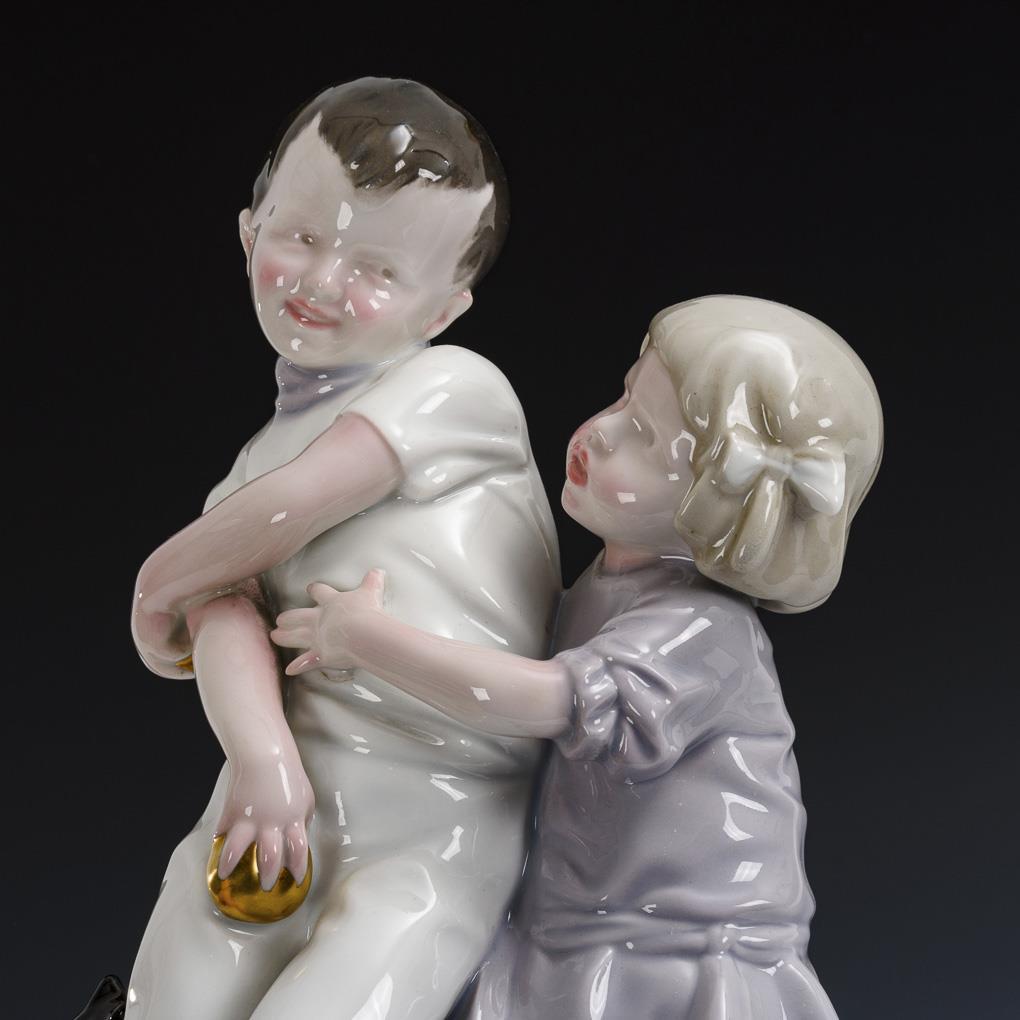 Auf einem Ovalsockel stehendes, sich um eine goldene Kugel zankendes Kinderpaar.