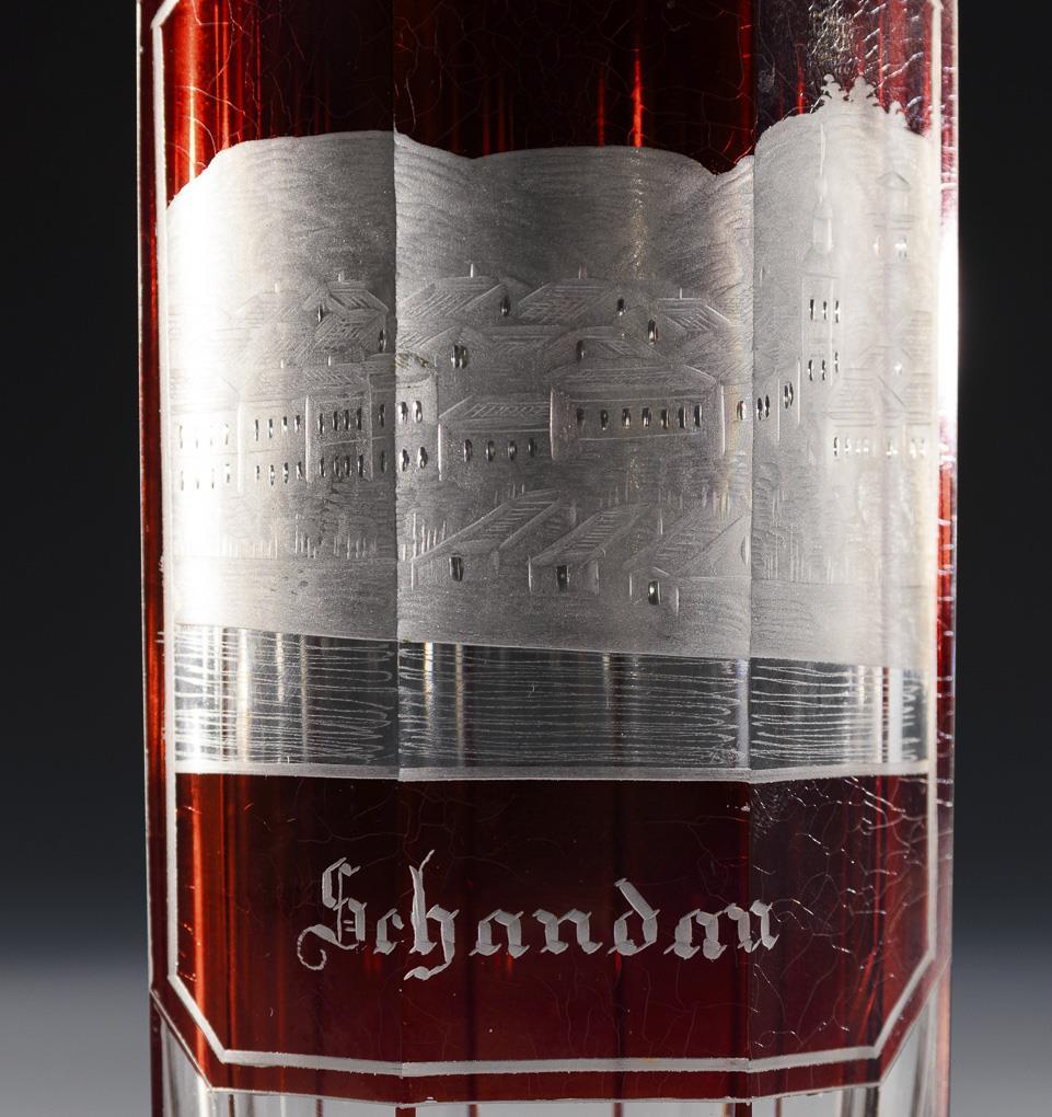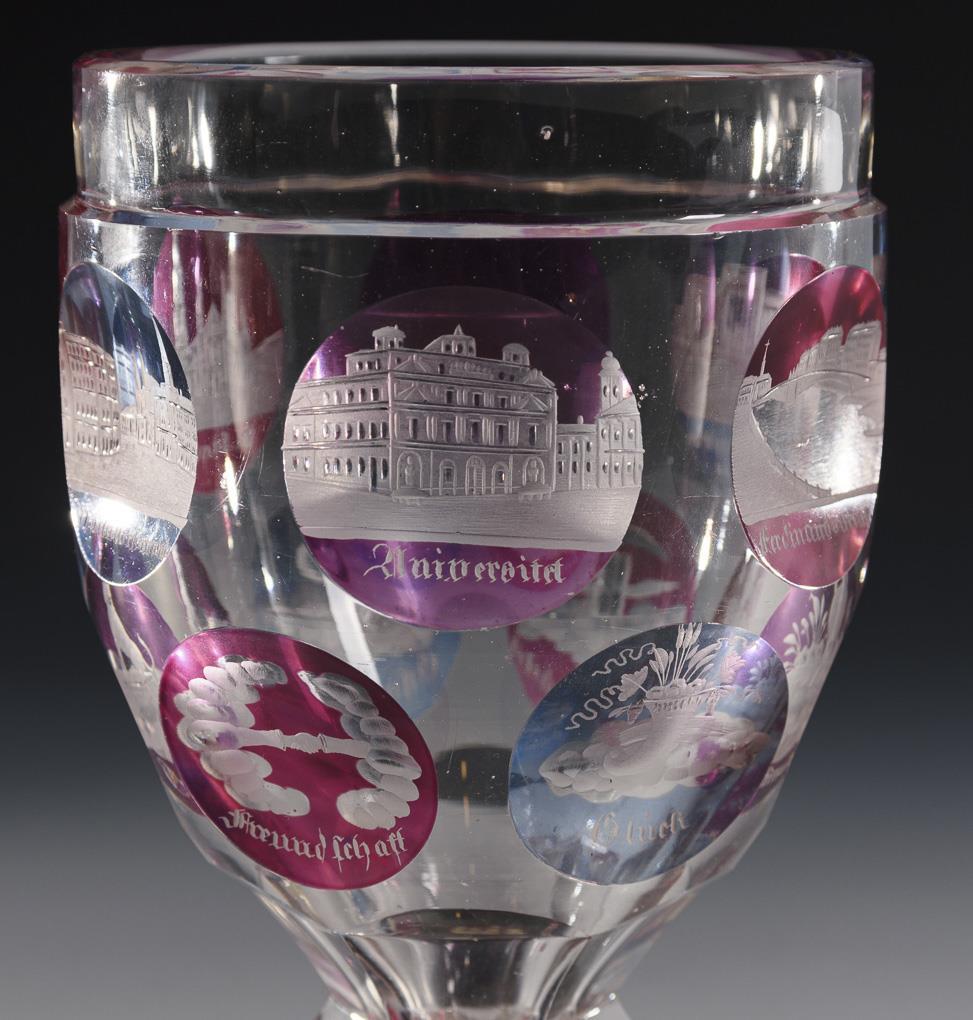 1x Pokal aus farblosem, partiell purpur, hellblau und violett gebeiztem Glas: halbovoide Kuppa, facettierter Schaft, passiger Fuß; in geschliffenen Linsen gravierte Ansichten von Wien sowie Symbole mit der Bezeichnung "Gesundheit, Treue, Freundschaft, Glück und Freude bringe Ihnen die Zeit. / 1x achtfach facettierter Becher aus farblosem, teils rot gebeiztem Glas mit einer schauseitig gravierten Ansicht von Schandau. Minimale Bestoßungen am Fuß des Pokals; 2 minimale Bestoßungen am Becher.
