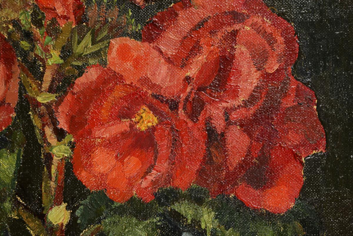 Große Topfpflanze mit herrlich leuchtend roten Blüten.