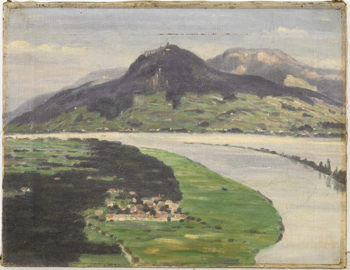 Breiter Flusslauf vor hohen Bergen mit Burgruinen unter sommerlichem Himmel.