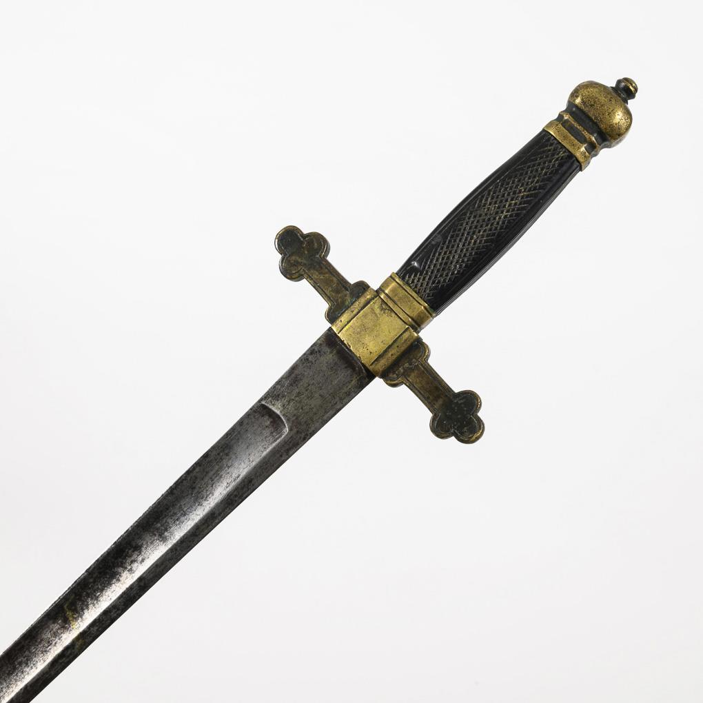 Gerade, einschneidige Klinge mit breitem Hohlschliff und Spitze in der Mittellinie. Kreuzförmiger Griff mit hölzernem Griffstück, Lederscheide.