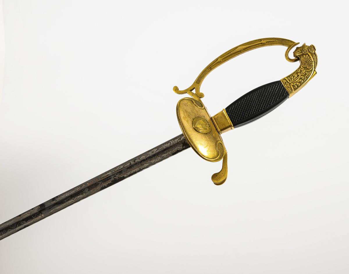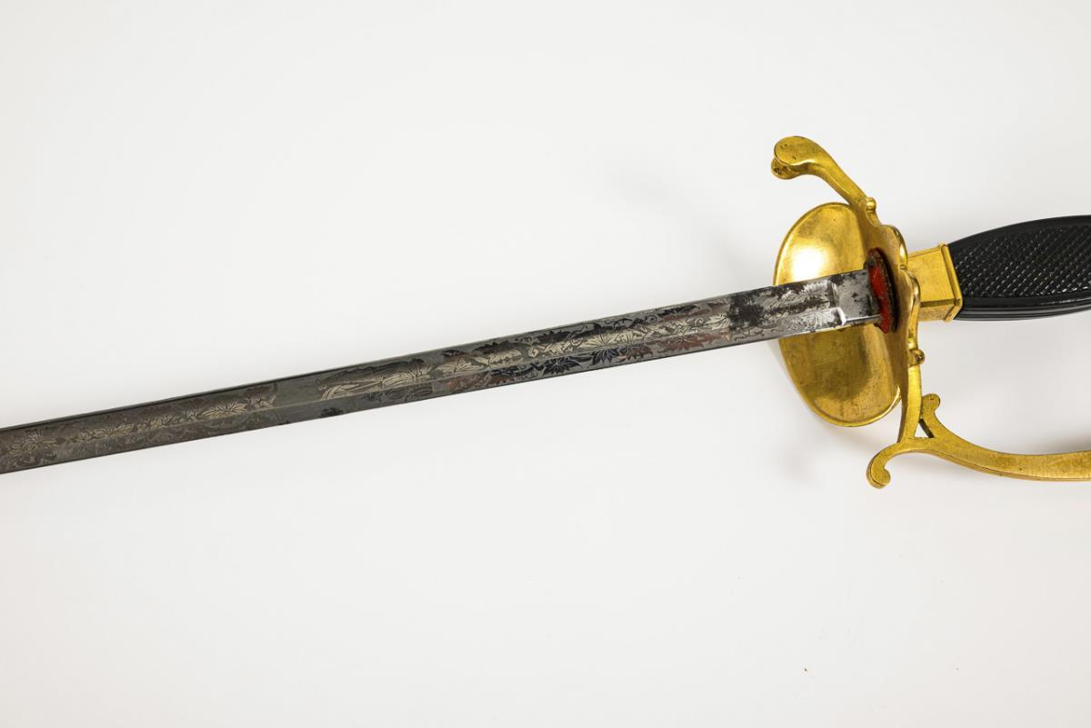 Gerade schmale, einschneidige Klinge mit geätztem Muster. Messinggefäß mit Ritterkopfknauf und Holzgriff. Auf Stichblatt Wappen der Hohenzollerischen Lande. Schwarze Lederscheide. Klinge mit kleineren Korrosionsstellen, Scheide mit stärkeren Altersspuren.