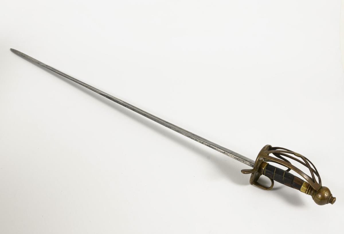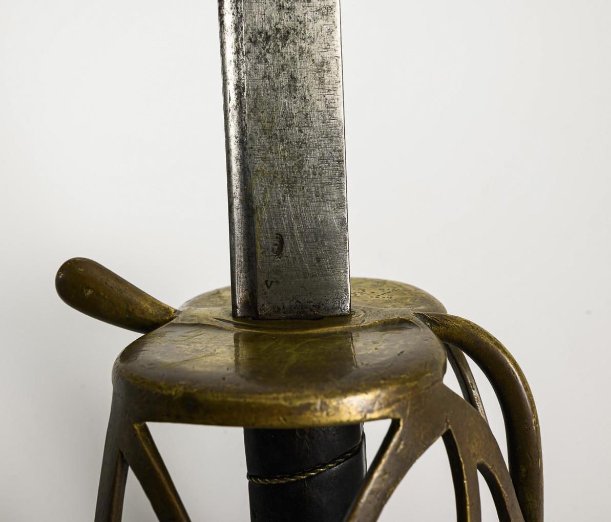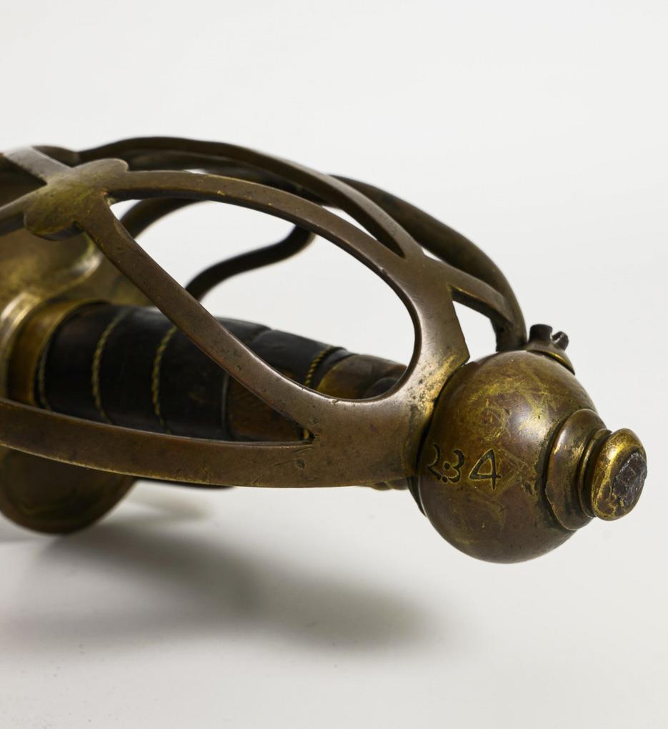 Gerade, einschneidige Klinge mit breitem Hohlschliff. Messinggefäß mit mehreren, sich teils überkreuzenden Spangen, Daumengriff und großer Kugelknauf. Lederumwickelter Holzgriff mit gedriller Drahtwicklung. Auf dem Knauf gepunzt "2:34", Unterseite des doppelten Stichblattes gepunzt "Z.E.". Lederwicklung defekt.