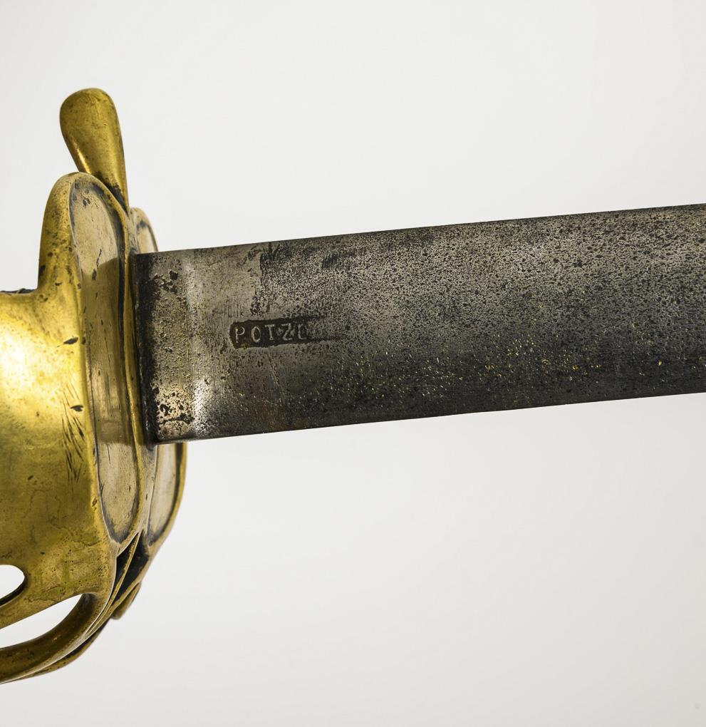 Wohl gute Kopie. Zweischneidige Klinge gemarkt mit "Potz(dam)" und wohl Adlermarke. Messingkorp mit reliefiertem Adler, auf der Brust "R". Griff mit Lederwicklung und einfacher Drahtwicklung. .
