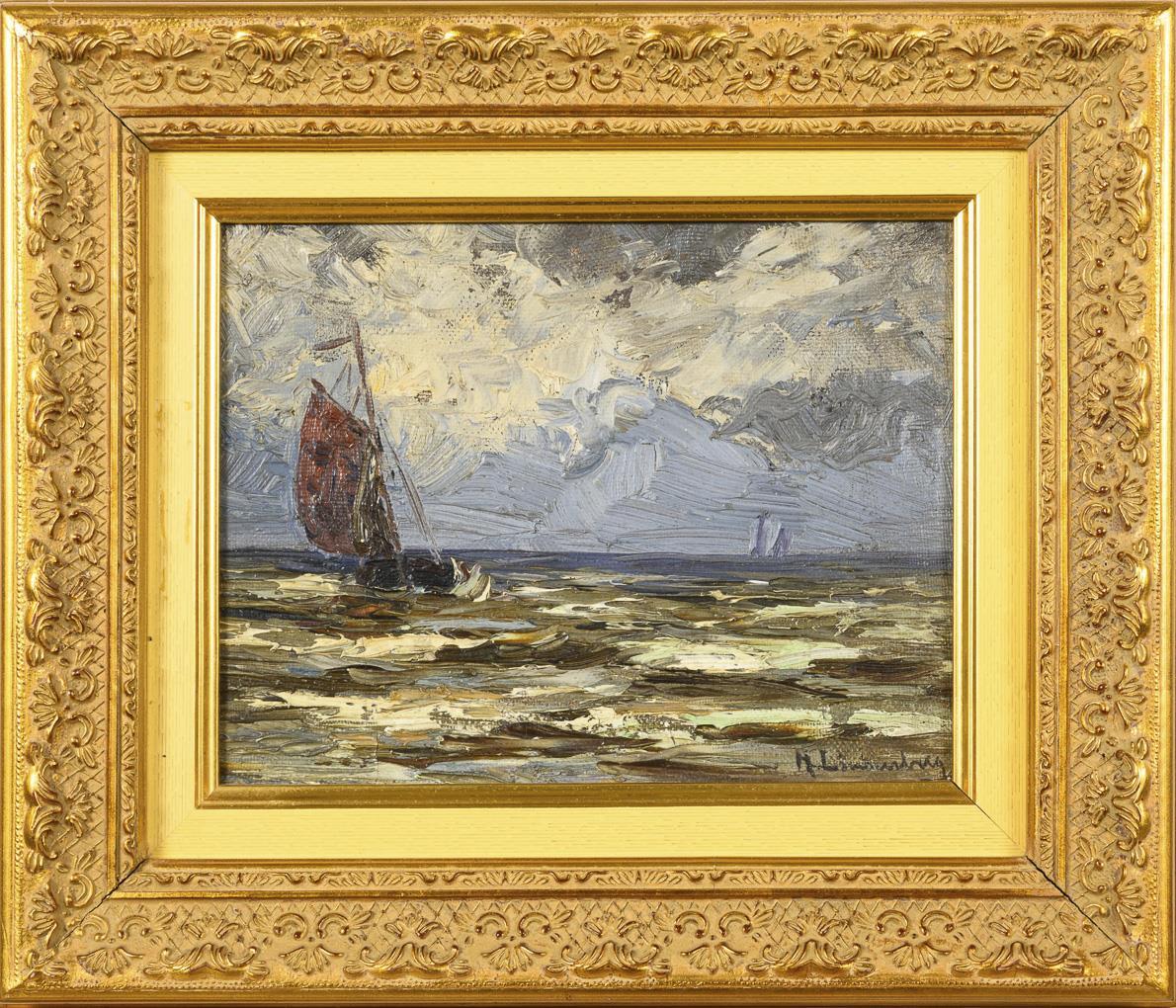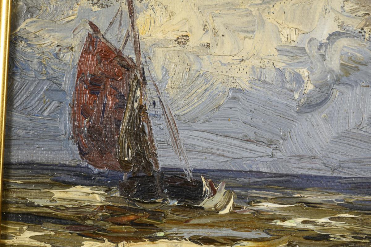 Pastos gemalte Meereslandschaft mit Segelboot nahe dem Strand und Schiffen am Horizont. Minimale Altersspuren.