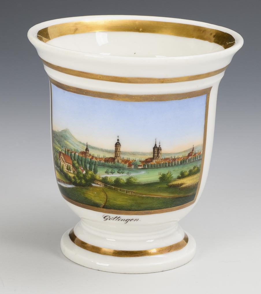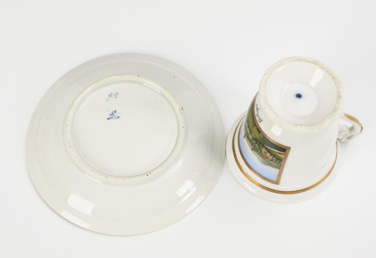 Gefußte Glockentasse mit Löwenkopfhenkel. Schauseitig eine goldgerahmte Rechteckkartusche mit der bezeichneten Ansicht der Stadt Göttingen, im Spiegel der Untertasse die Widmung "C. von Laffert seinem Freund und Gönner F. Eichhorn Göttingen, d. 29. Nov 1833". Partieller Goldabrieb.