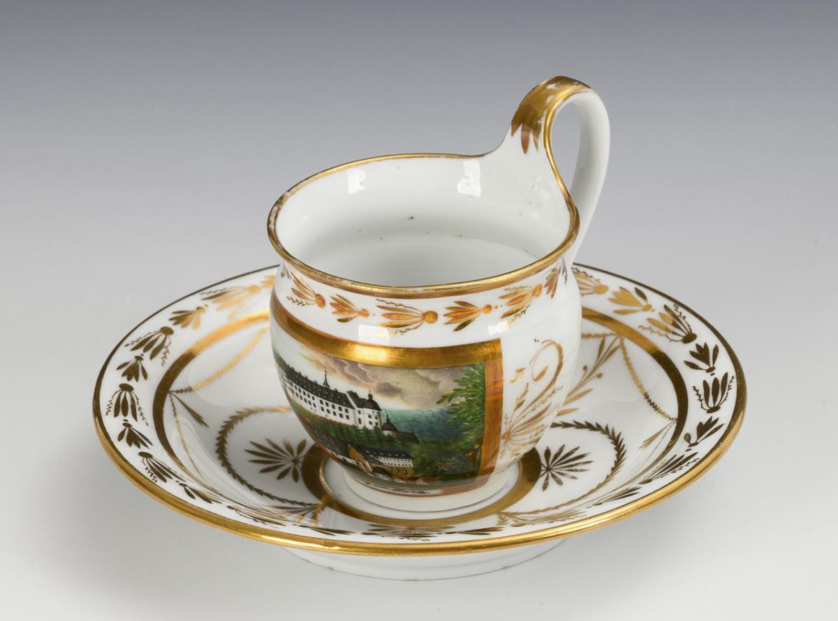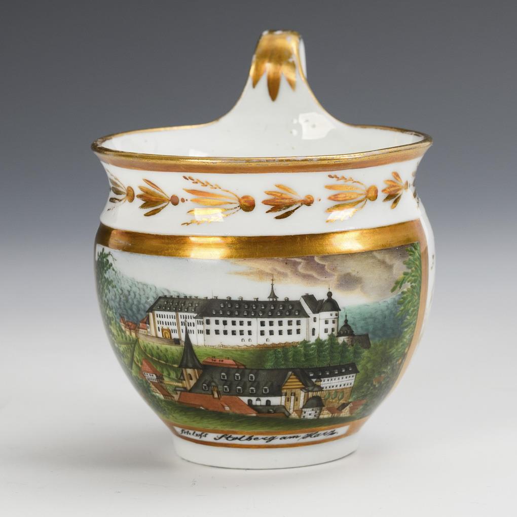 Campanertasse. Schauseitig eine goldgerahmte Rechteckkartusche mit der bezeichneten Ansicht des Schlosses Stolberg im Harz, verso florale Goldmalerei. Minimaler Goldabrieb.