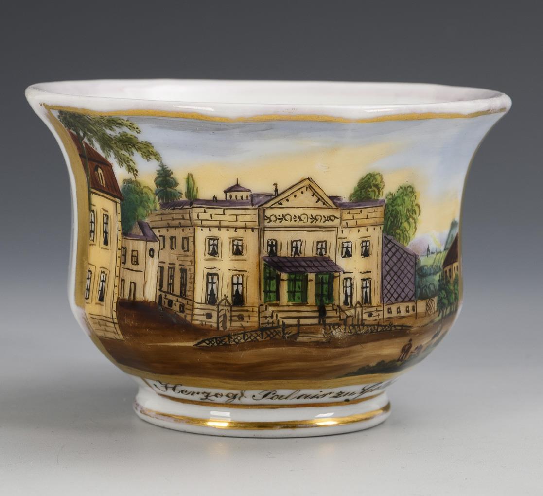 Polygonale Glockentasse mit spitz geschweiftem Henkel. Schauseitig eine goldgerahmte Rechteckkartusche mit der bezeichneten Ansicht des Herzoglichen Palais in Gotha. Gold berieben, Haarrissspinne in der Untertasse.