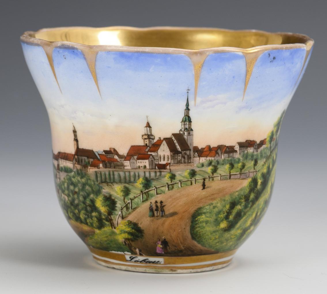 Glockentasse mit Rocaillehenkel. Schauseitig eine goldgerahmte Rechteckkartusche mit der bezeichneten Ansicht der Stadt Löbau bei Görlitz. Partieller Goldabrieb.