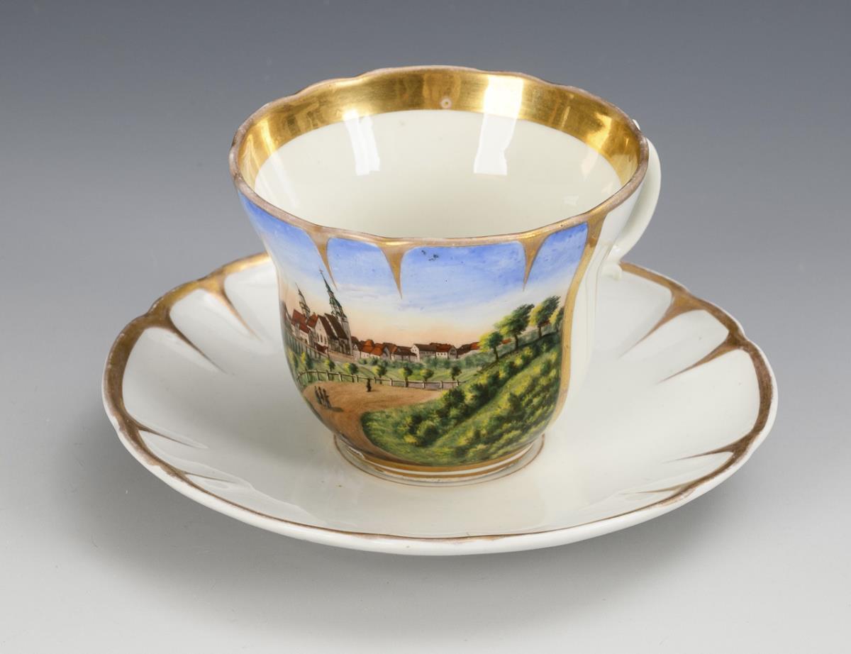 Polychrom bemalt, goldstaffiert. Tasse (H 7 cm), originale Untertasse (Ø 14,5 cm).