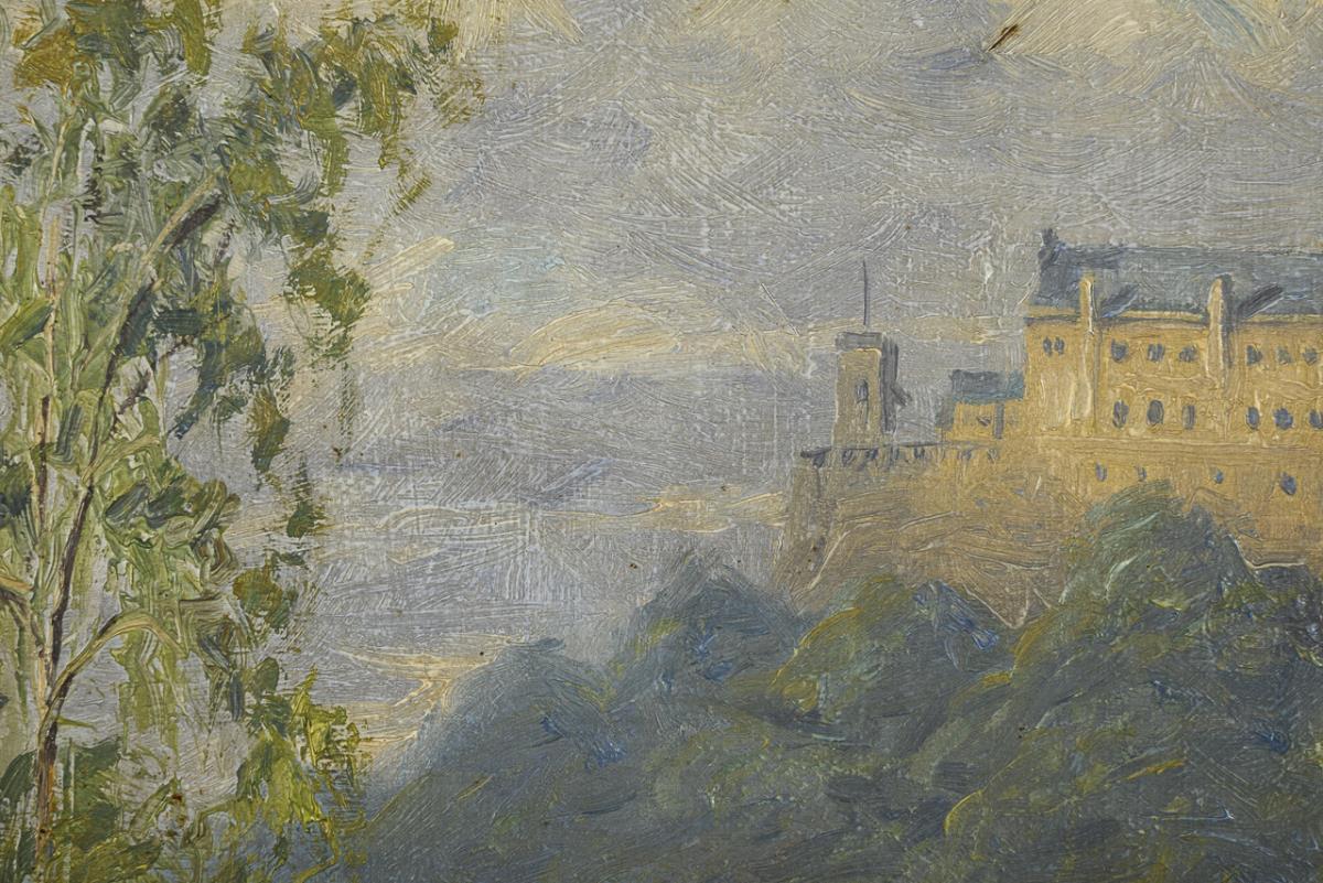 Blick von einem Weg zur mittelalterlichen Burg bei Eisenach unter aufziehenden, dunklen Wolken. Minimale Altersspuren.