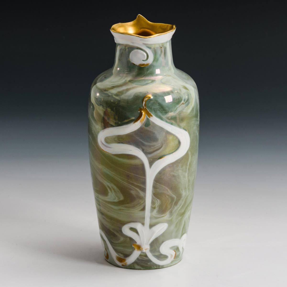 Marmorierende, lüstrierende Farbglasur, goldstaffiert. H 18,5 cm.
