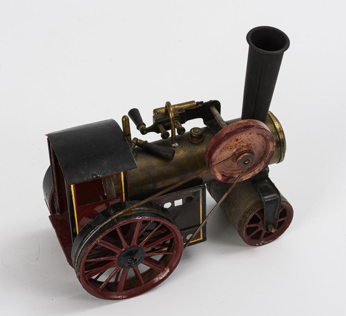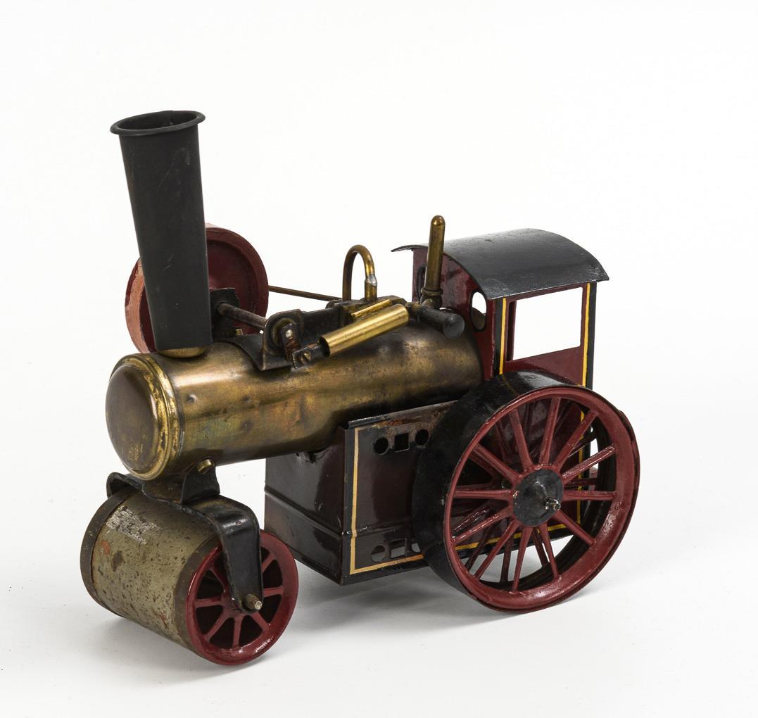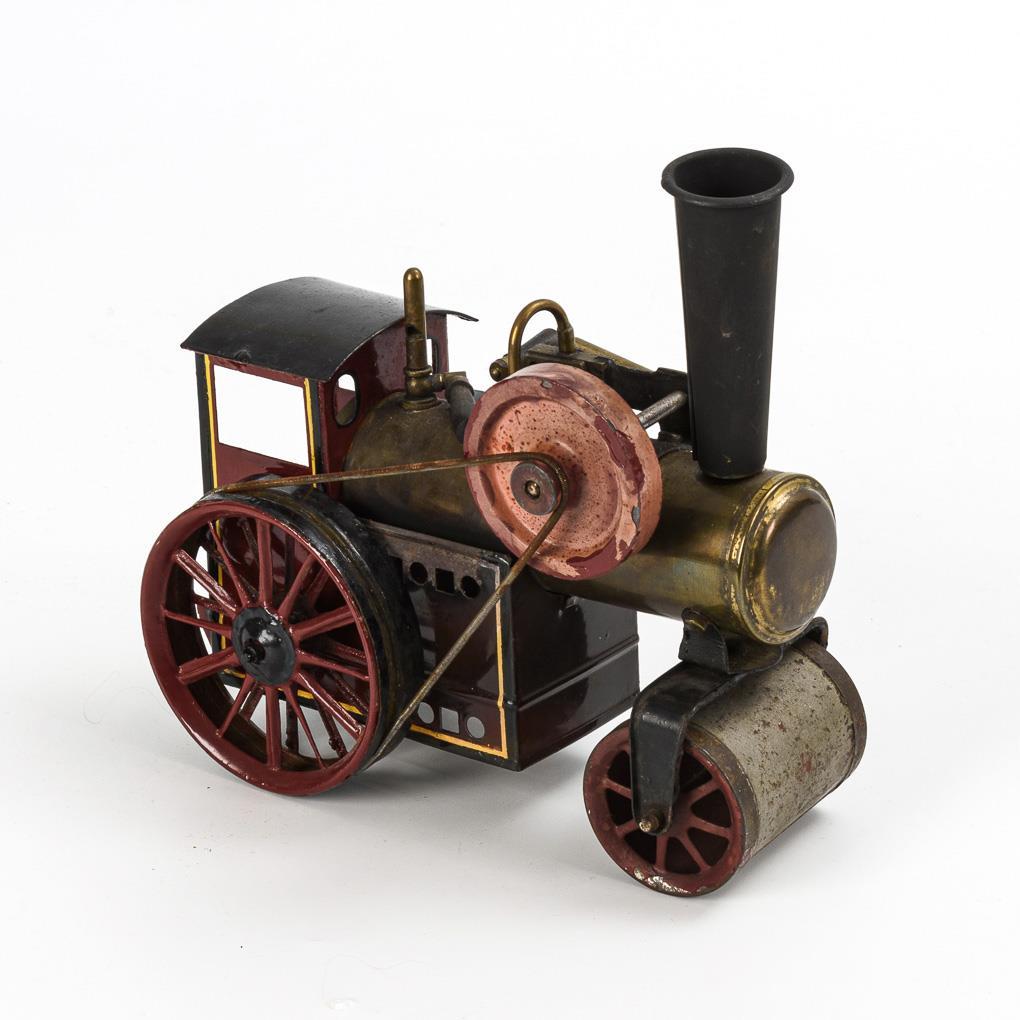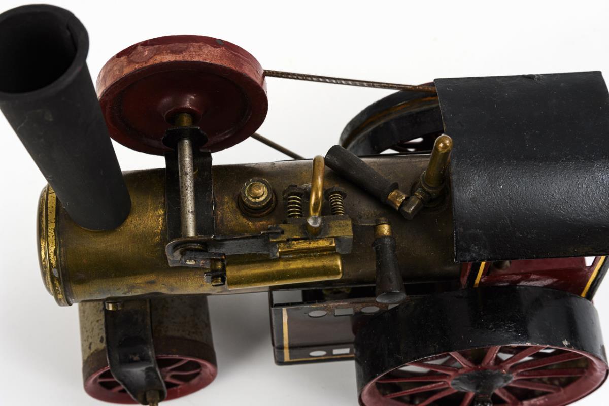 Kleine Lokomobile mit Brenner, liegendem Kessel und oszillierendem Zylinder. Altersspuren, kleine Lötstellen, nachlackiert.