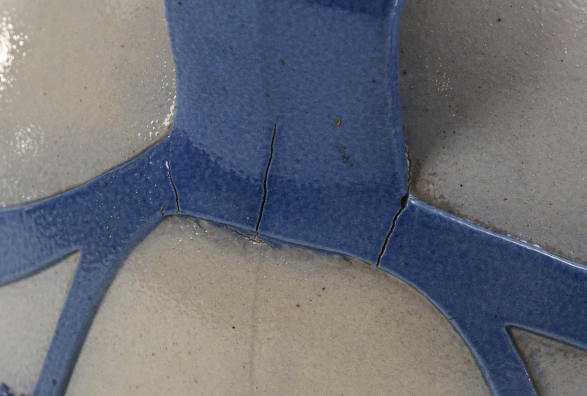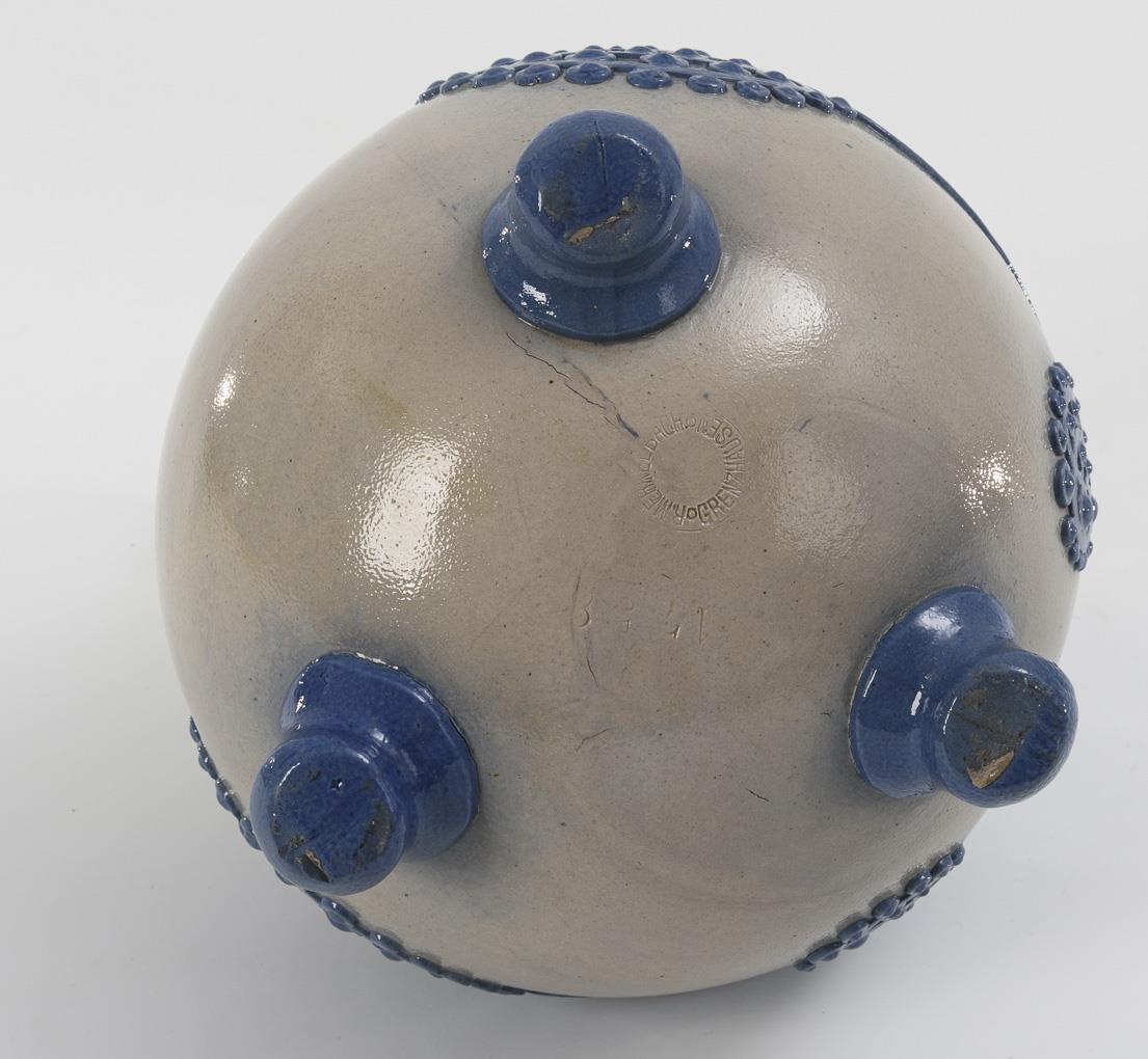 Graues, salzglasiertes Steinzeug mit taubenblau gefassten Auflagen. H 28 cm.