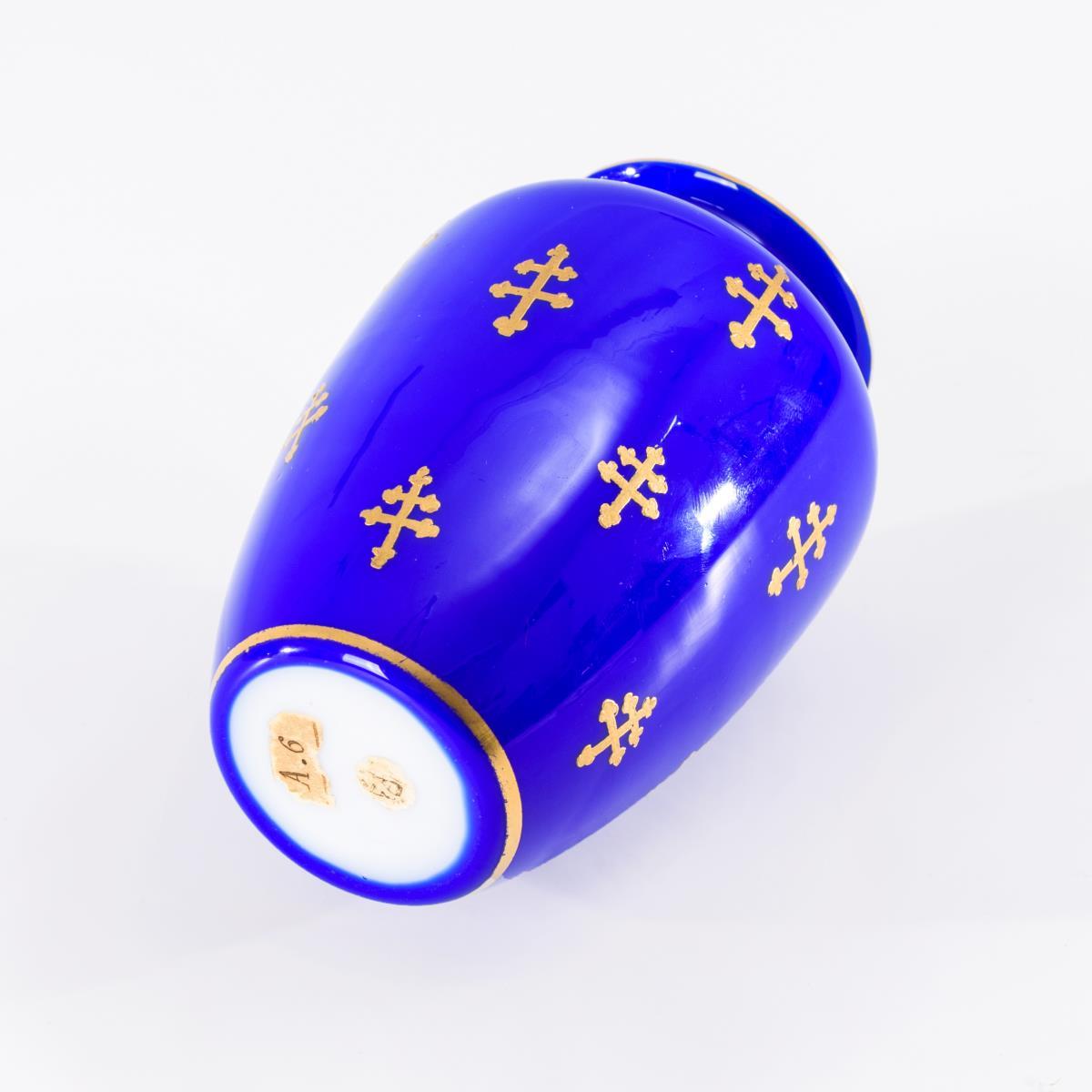 Milchglas mit kobaltblauem Überfang, goldgemalte Lothringerkreuze, ausgekugelter Abriss.