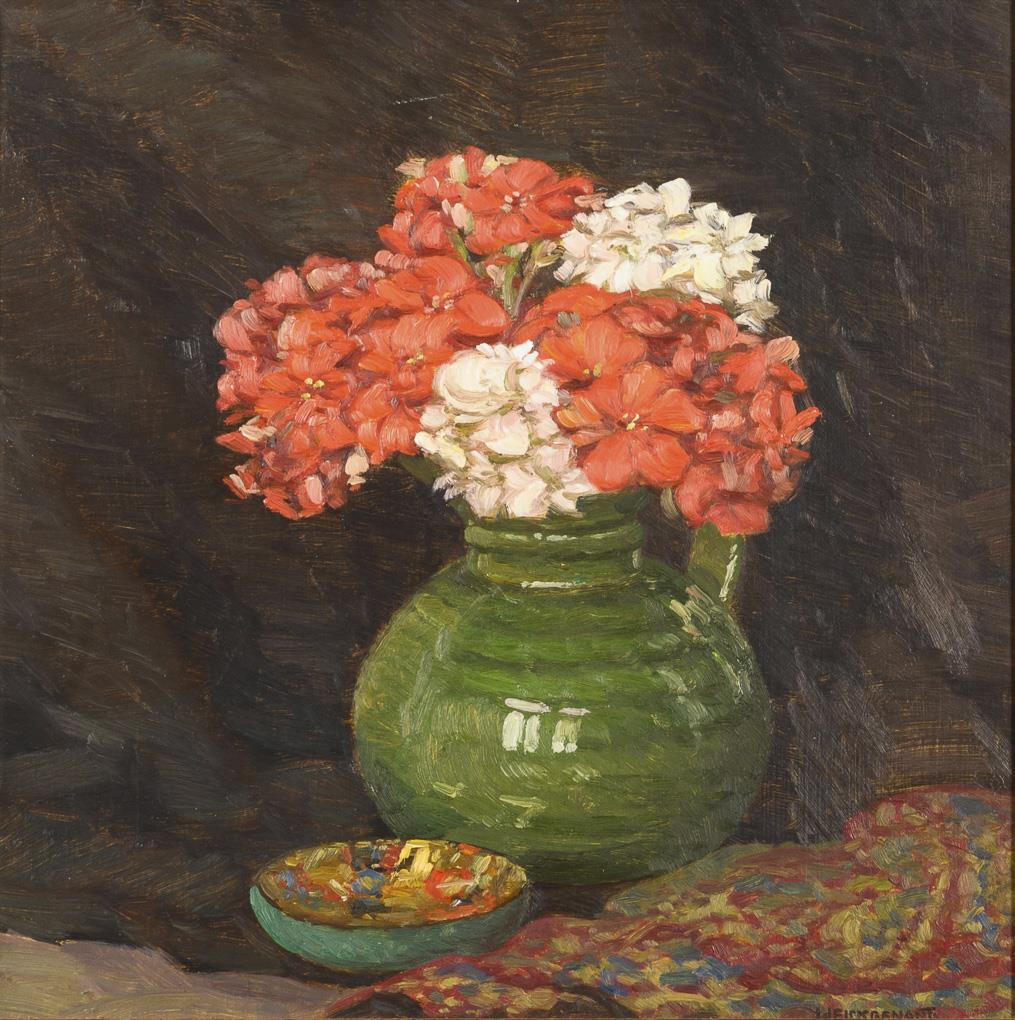 Die weißen und roten Blumen in grüner Kanne neben einer Schale. Kleiner Kratzer.