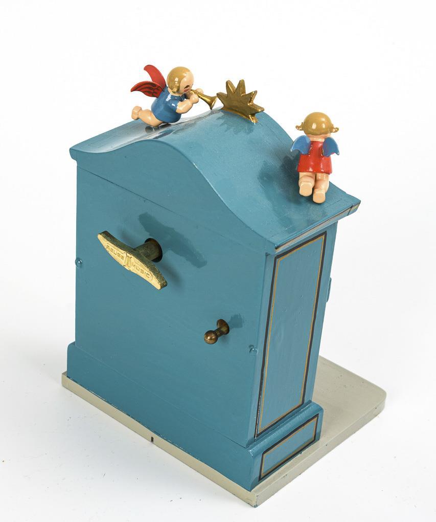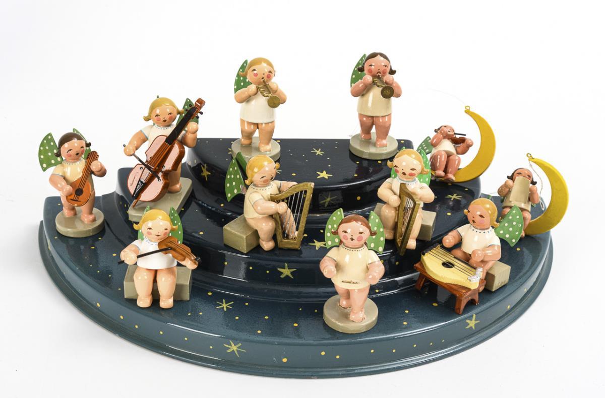 Orgel mit Spieluhr (spielt O du fröhliche), 9-köpfige Engelkapelle, 2 musizierende Engelchen auf Halbmond als Baumschmuck und halbkreisförmige Treppe. Werk der Spieluhr intakt, Treppe mit geklebtem Bruch, teils kleine Defekte und Fehlteile.