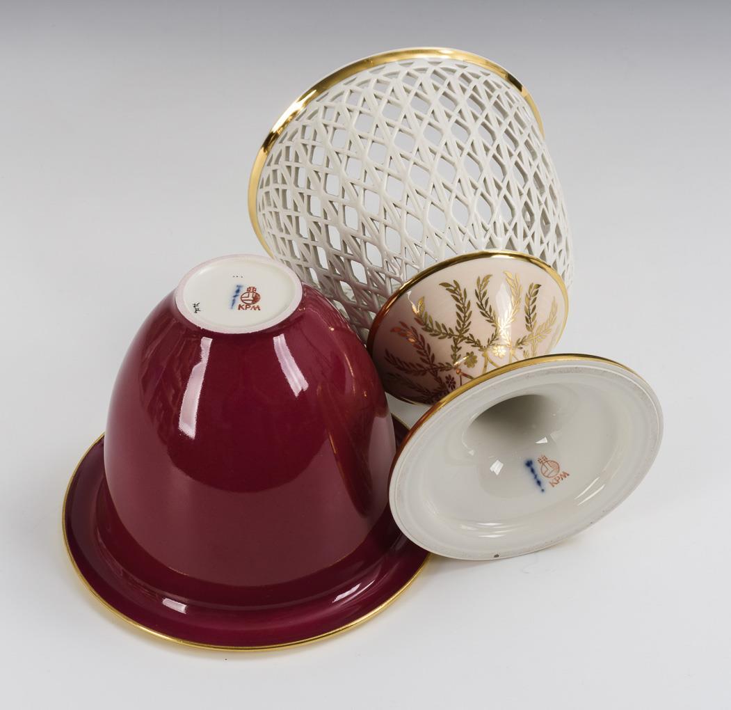 Weiß, partiell bordeauxfarbener Fond, teils gravierte Goldmalerei. H 18,5 cm.