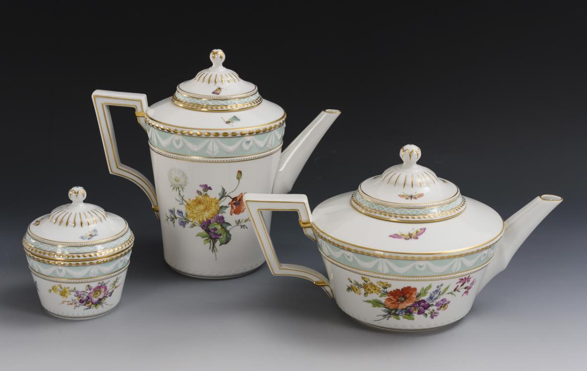Kaffeekanne (H 21,5 cm), Teekanne (H 15,5 cm), Zuckerdose, 3 Mokkatassen mit 3 Untertassen, 1 Frühstücksteller und 1 Blattschale (L 23,5 cm).
