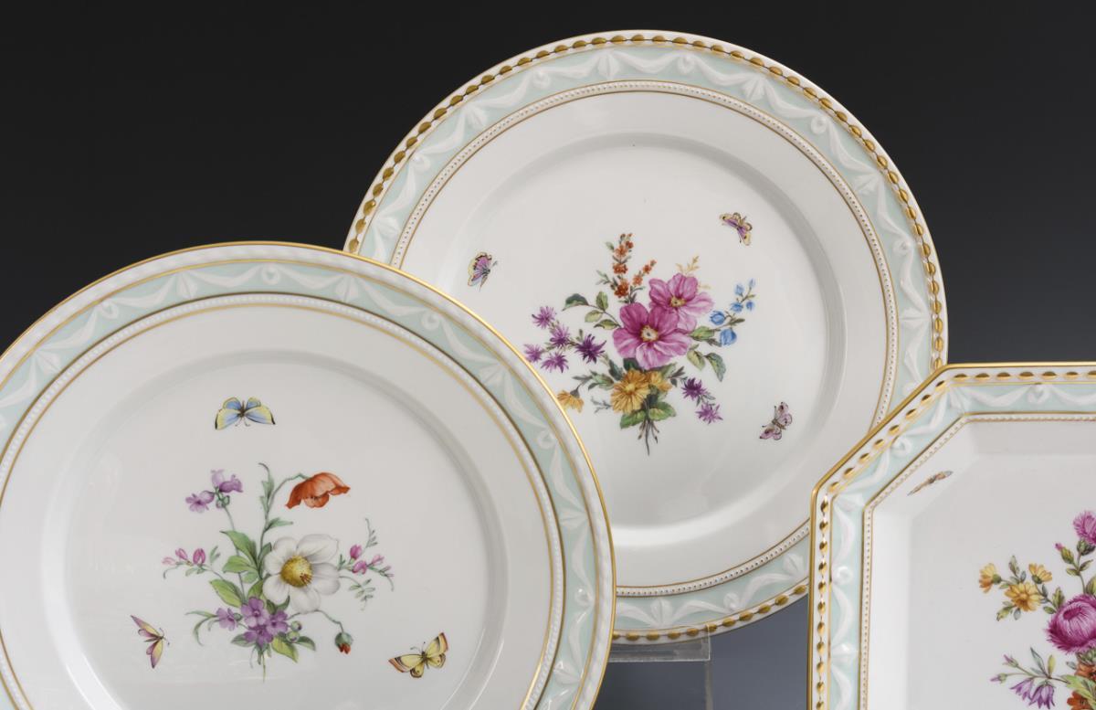 Polychrome Blumen- und Insektenmalerei, Goldstaffage. 5 Speiseteller (davon 2 mit etwas abweichender Fahnengestaltung; Ø 25,5 cm), Terrine (Ø 26 cm), Quadratschüssel (22 x 22 cm).