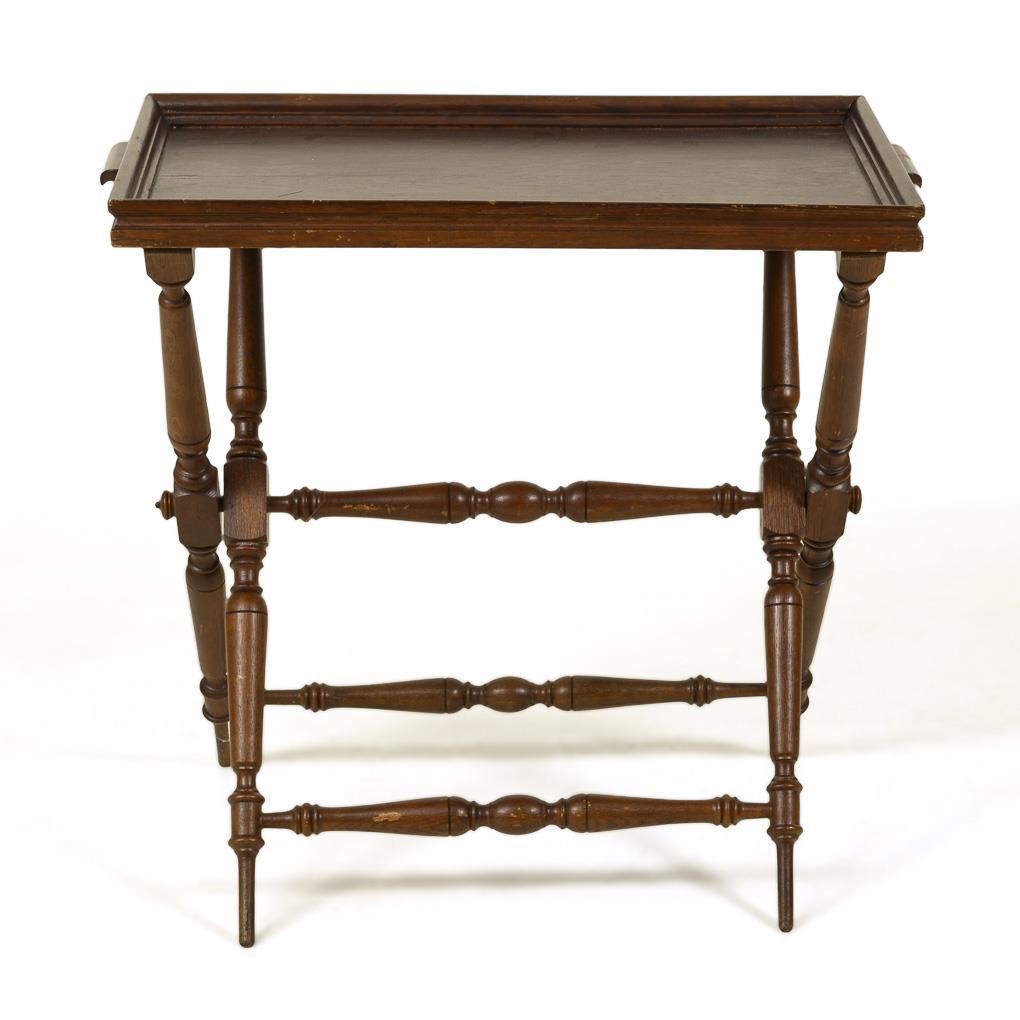 Transportabler Tisch mit abnehmbarem Tablett und 2 seitlichen Griffen auf klappbarem Drechselgestell mit 2 Lederriemen. Alters-/Gebrauchsspuren.