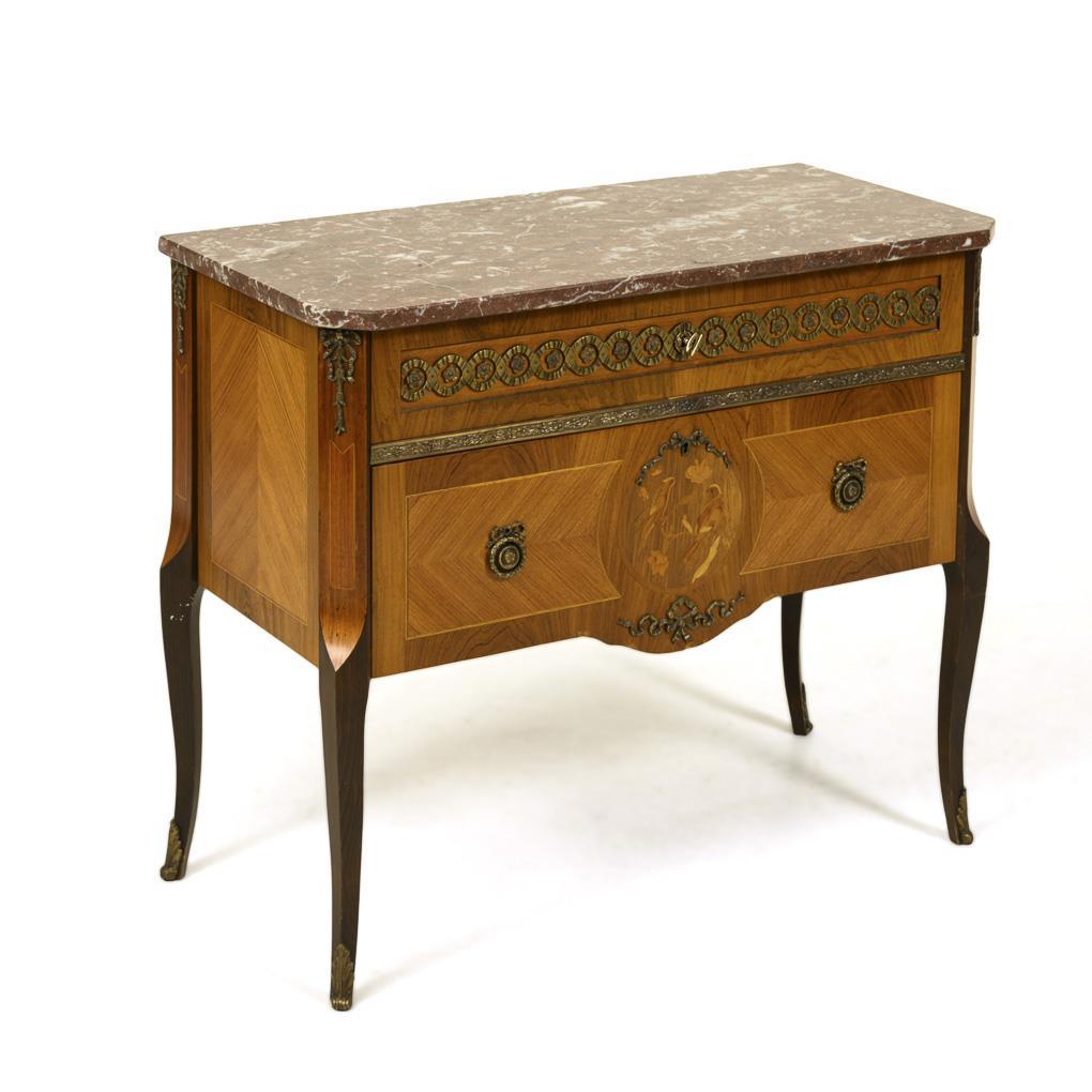 2-schübige, im klassizistischen Stil gestaltete Kommode auf 4 leicht ausgestellten Beinen, mit lose aufliegender, rötlich-grauer Marmorplatte; verziert mit Vogelmarketerie, Messingbändern und Messingbeschlägen. Leichte Alters-/Gebrauchsspuren.