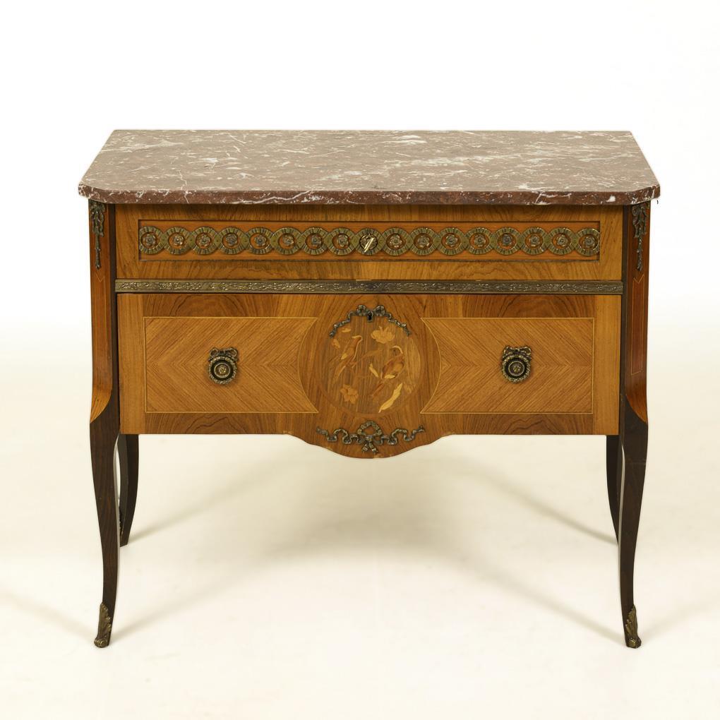 2-schübige, im klassizistischen Stil gestaltete Kommode auf 4 leicht ausgestellten Beinen, mit lose aufliegender, rötlich-grauer Marmorplatte; verziert mit Vogelmarketerie, Messingbändern und Messingbeschlägen. Leichte Alters-/Gebrauchsspuren.
