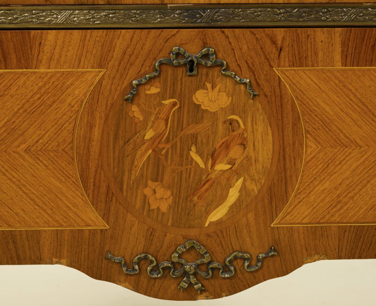 Verschiedene Hölzer furniert und marketiert, rötlich-grauer Marmor. Ca. 73 x 86,5 x 41 cm.