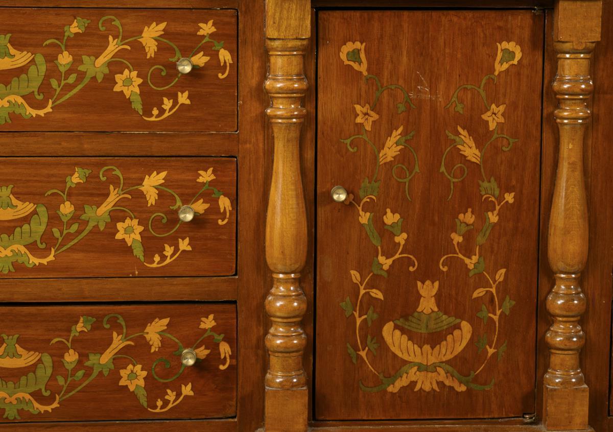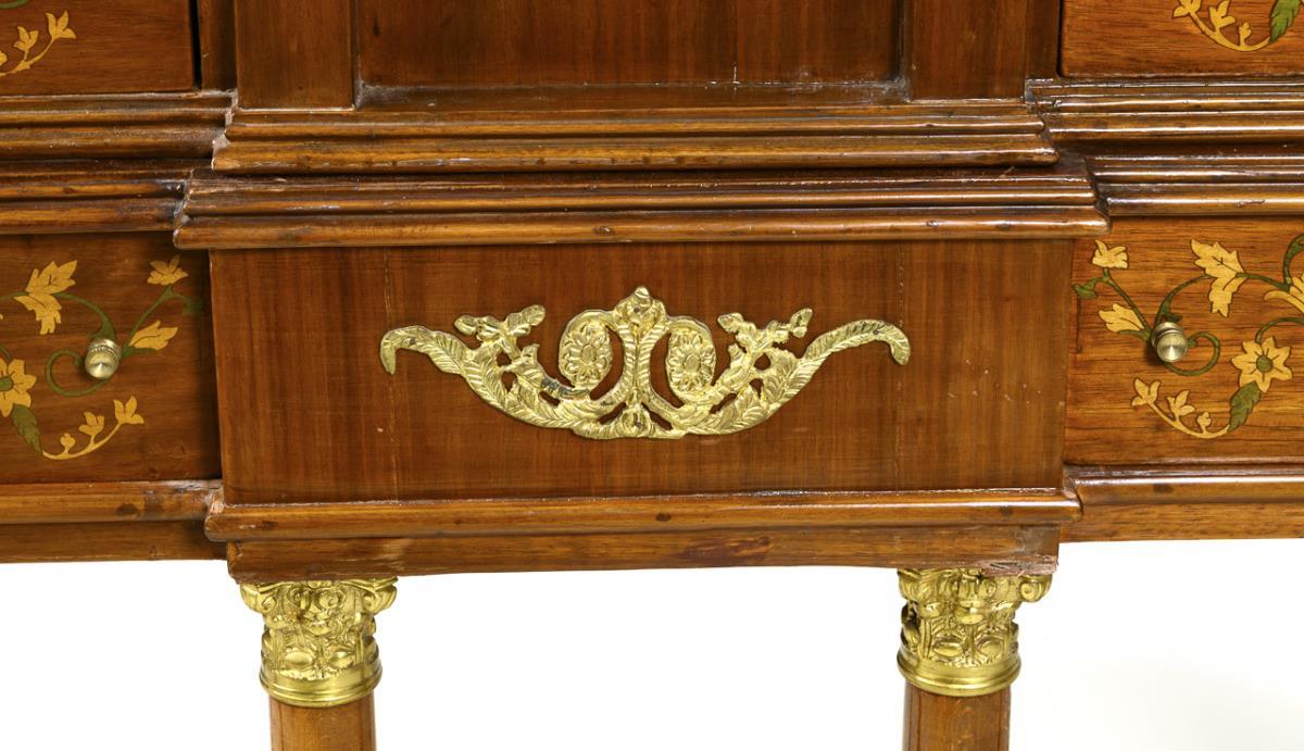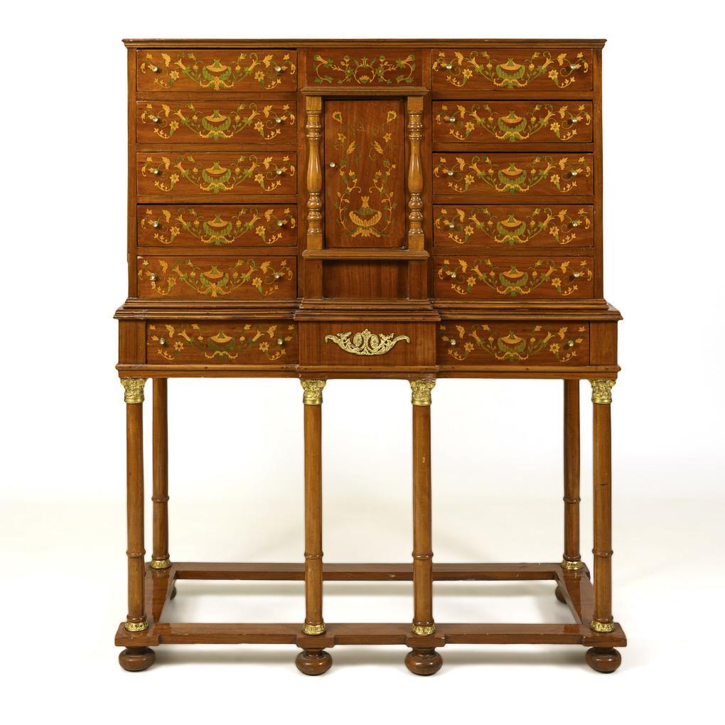 12-schübiger Kabinettaufsatz mit zentralem Türfach, auf 6 Säulen mit gedrückten Kugelfüßen und Fußverstrebung; verziert mit floralen Intarsien und Bronzebeschlägen. Alters-/Gebrauchsspuren, Furnier mit kleinen Bestoßungen.