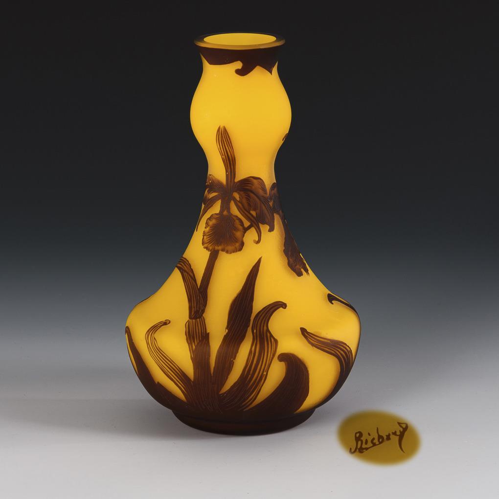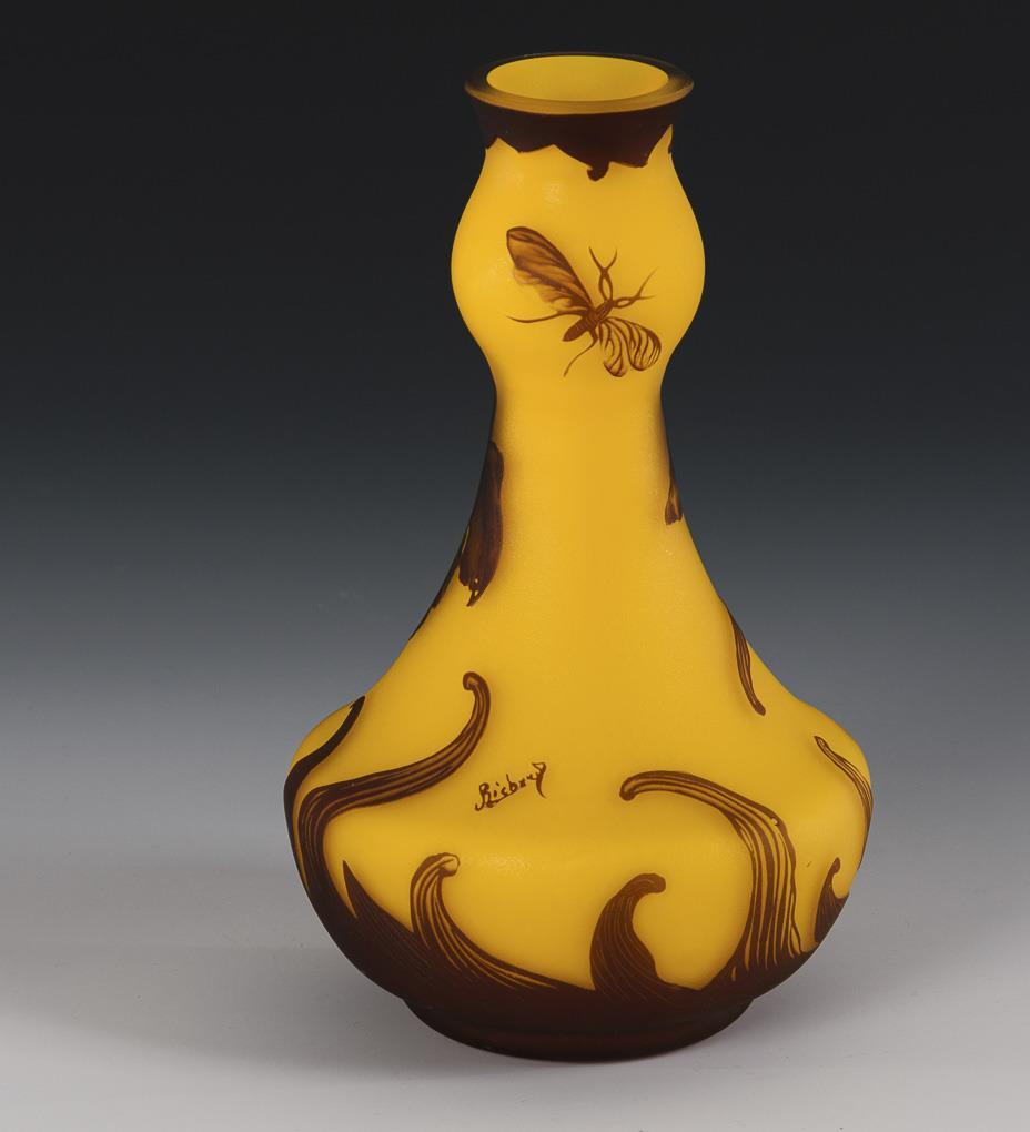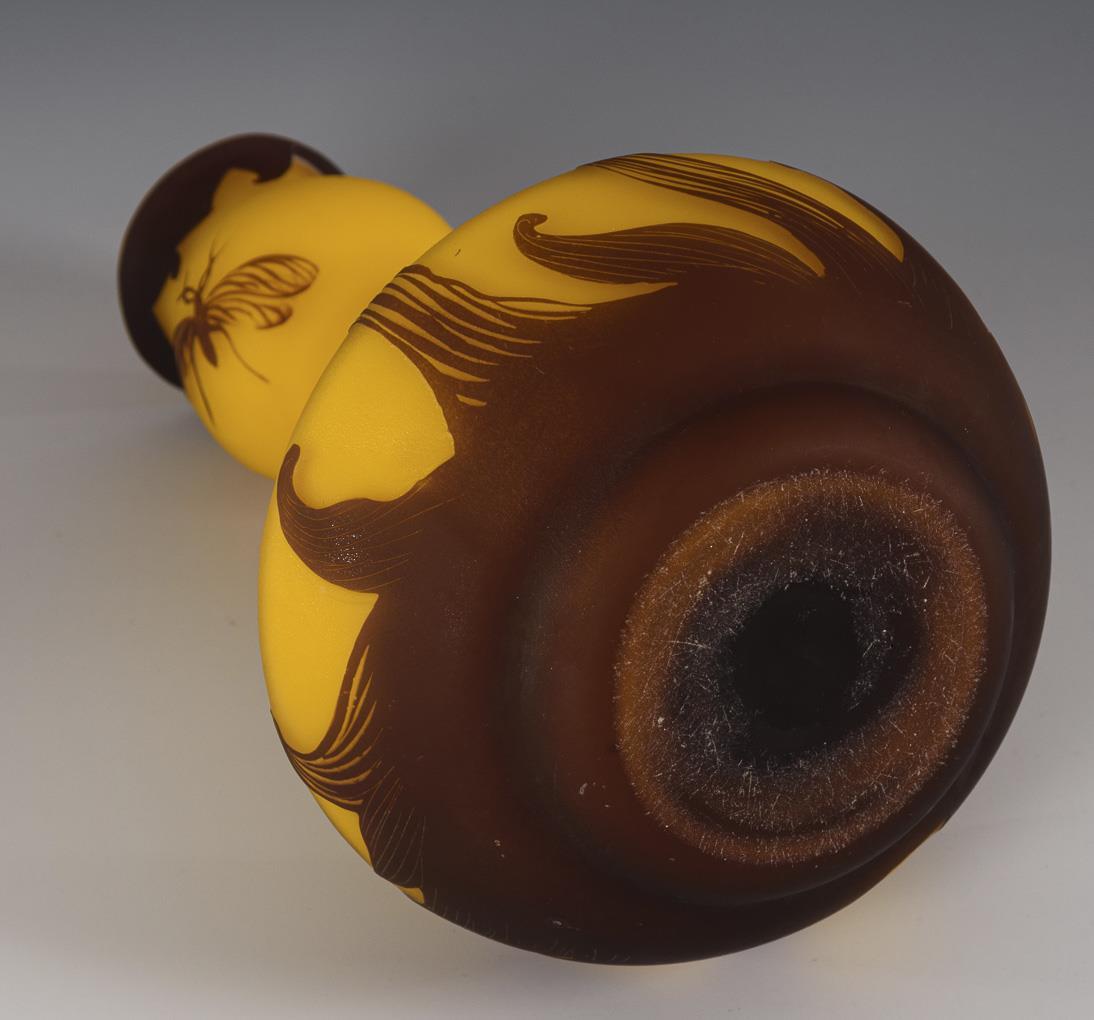 Farbloses Glas mit opalgelbem Innenfang und braunem Überfang. H 20,5 cm.