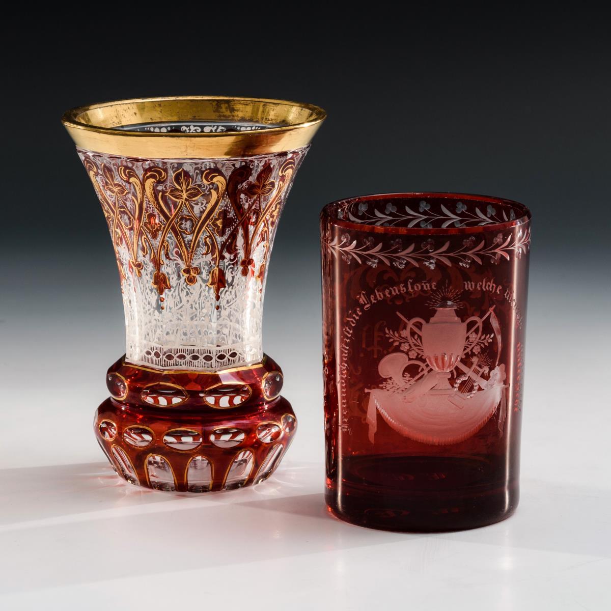 1x Fußbecher mit reichem, gemaltem Ornamentdekor in Rot, Weiß und Gold. / 1x Zylinderbecherbecher mit teils geblänktem Mattschliffdekor: schauseitig ein Symbolbukett mit der Umschrift "Freundschaft ist die Lebenssonne welche niemals untergeht", verso das Monogramm " J. A. P." sowie unterseitig das Monogramm "F. E.". Minimaler Goldabrieb, Fußbecher mit Randsrestaurierung, Zylinderbecher mit Gebrauchsspuren.
