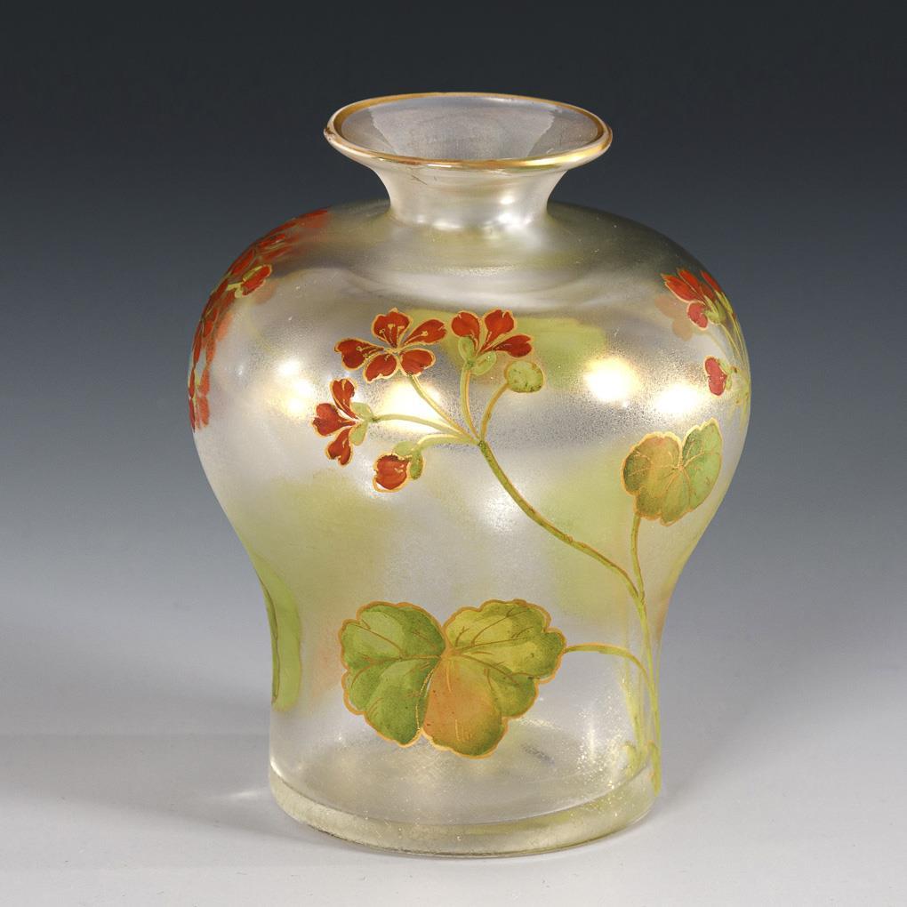 Balusterväschen mit zwei emailgemalten Geranienpflanzen; ausgekugelter Abriss.