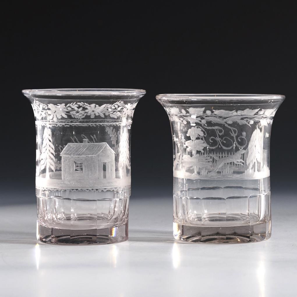 Am Ansatz facettierte Kraterbecher, 1x mit Landschafts- und Hausdarstellung unter einer Floralbordüre und der Bezeichnung "Hellena" sowie 1x mit der Darstellung eines Jägers mit Hunden und dem Monogramm "J.F.R.". 1x kleine Bestoßungen am Stand.