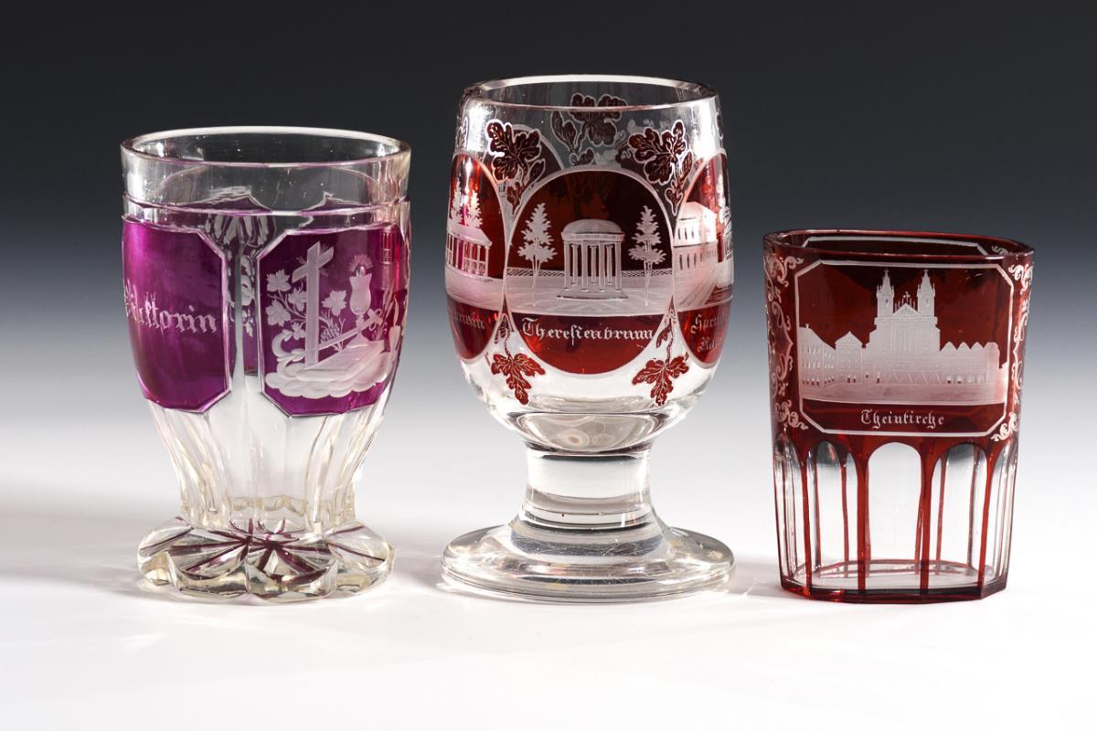 2 Gläser aus farblosem, rot gebeiztem Glas und gravierten Ansichten: Kelchglas mit Karlsbad-Ansichten (H 14 cm) und Bäderbecher mit Prag-Ansichten (H 10 cm). / 1 Kelchglas aus farblosem, violett gebeiztem Glas mit gravierten Symbolarrangements (H 12,5 cm). 1x mit Randbeschleifung.
