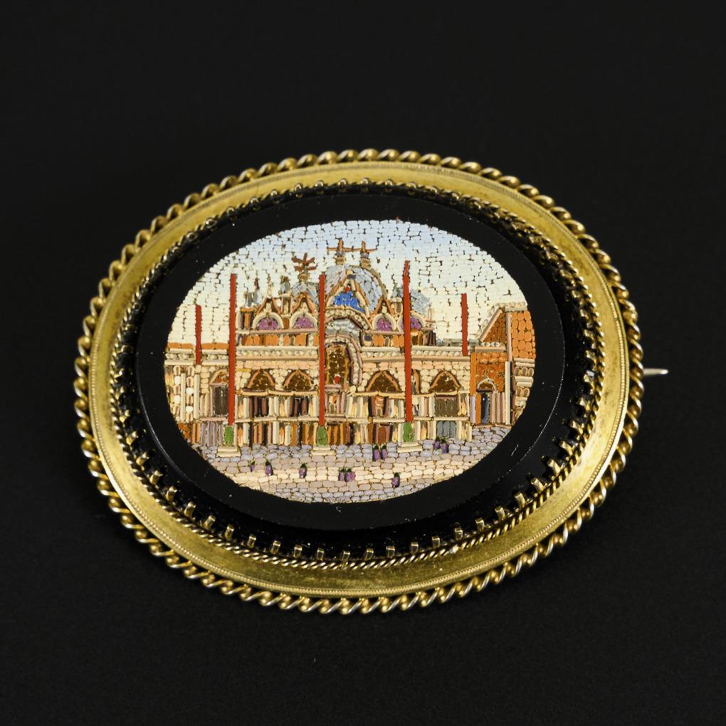 Eingelegtes Mosaik mit italienischem Architektur-Motiv, krappengefasst, mit kordelverziertem Rahmen. Hakenverschluss.