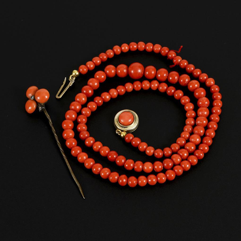 Schnürkette mit Korallenkugeln im Verlauf, an Zierschließe. Nadel mit 3 Korallenlinsen.